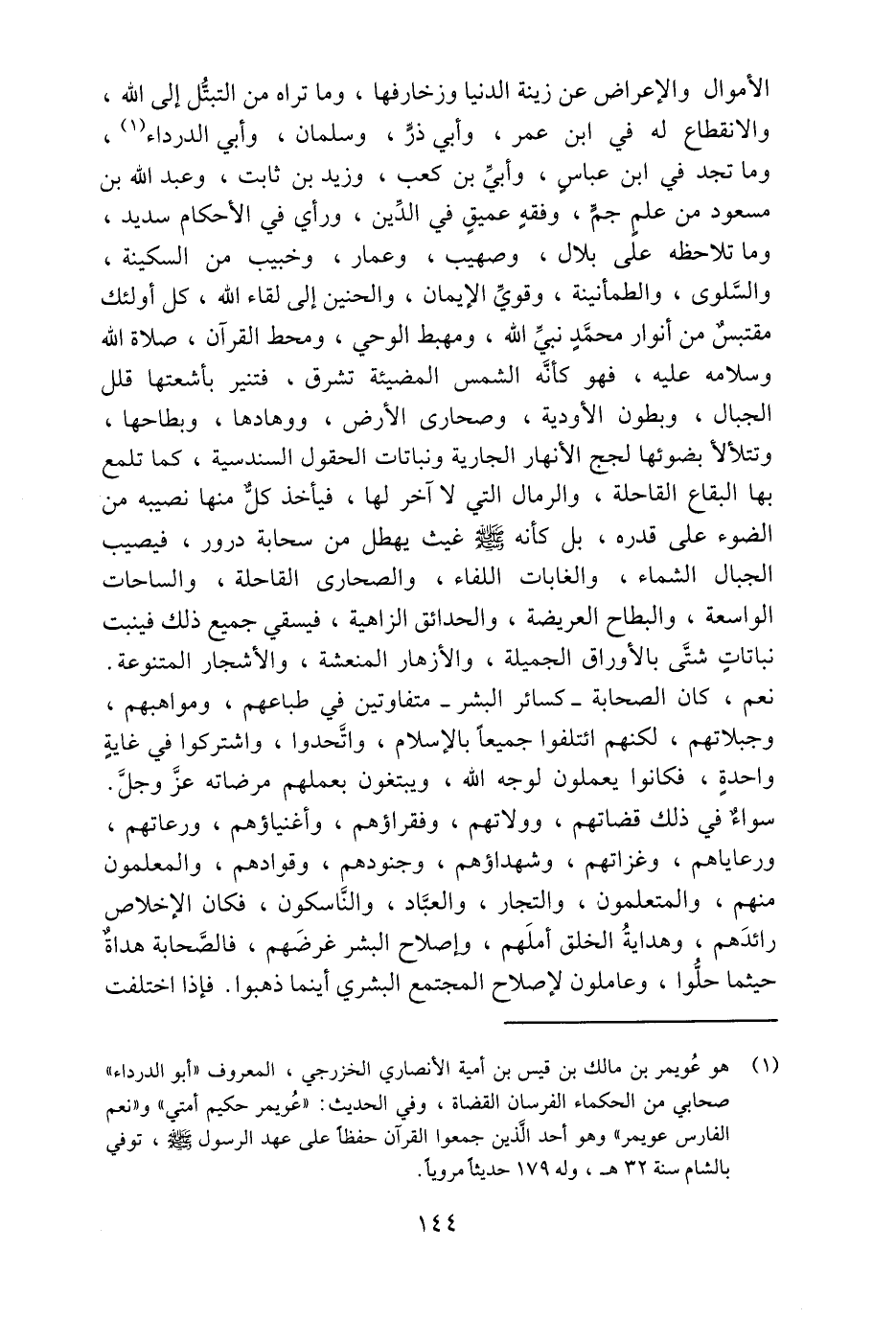 (1) هو عويمر بن مالك بن قيس بن أمية الأنصاري الخزرجي، المعروف «أبو الدرداء» صحابي من الحكماء الفرسان القضاة، وفي الحديث: «عويمر حكيم أمتي» و «نعم الفارس عويمر» وهو أحد الّذين جمعوا القرآن حفظا على عهد الرسول صلّى الله عليه وسلم، توفي بالشام سنة 32 هـ، وله 179 حديثا مرويا.