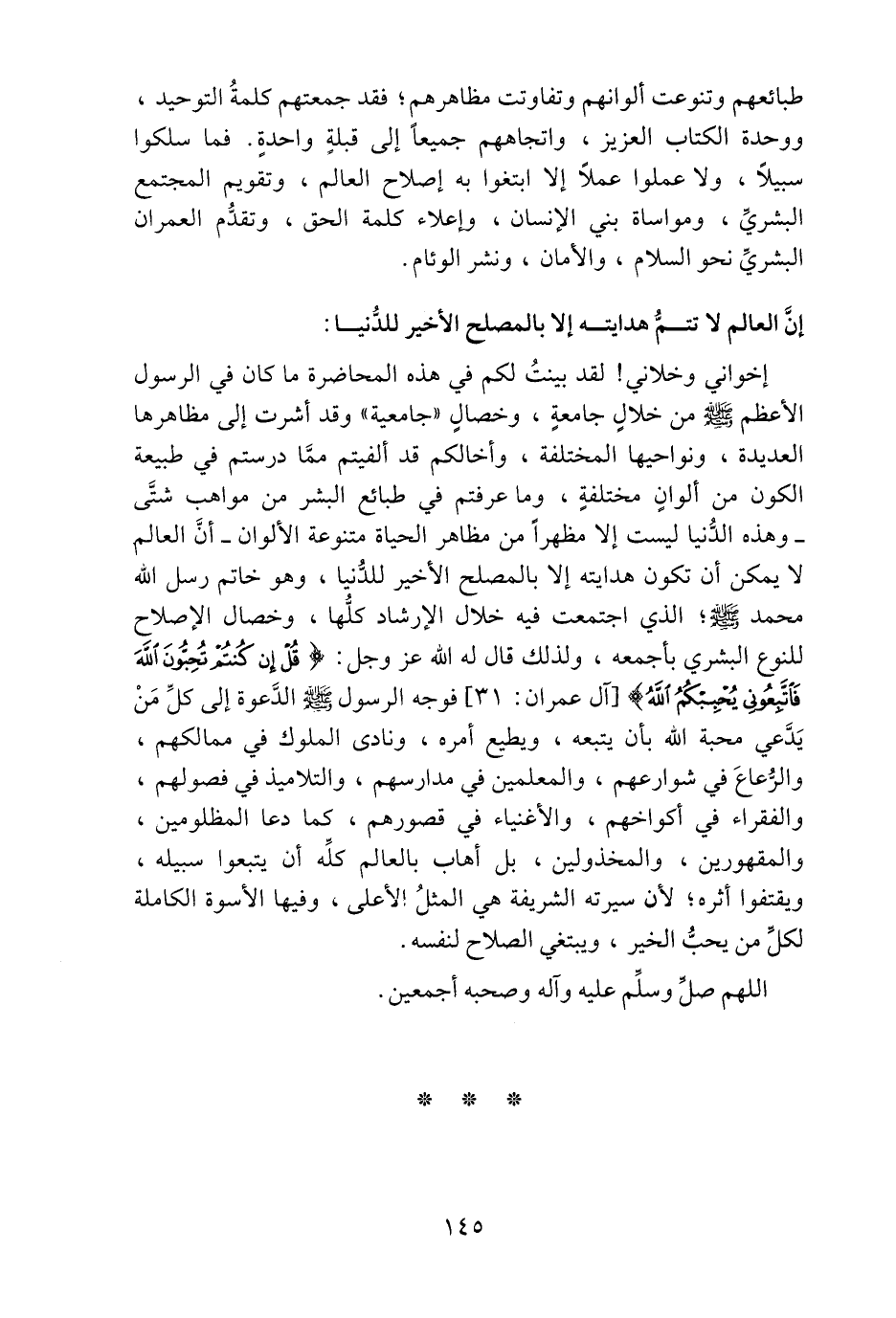 إخواني وخلاني! لقد بينت لكم في هذه المحاضرة ما كان في الرسول الأعظم صلّى الله عليه وسلم من خلال جامعة، وخصال «جامعية» وقد أشرت إلى مظاهرها العديدة، ونواحيها المختلفة، وأخالكم قد ألفيتم ممّا درستم في طبيعة الكون من ألوان مختلفة، وما عرفتم في طبائع البشر من مواهب شتّى وهذه الدّنيا ليست إلا مظهرا من مظاهر الحياة متنوعة الألوان- أنّ العالم لا يمكن أن تكون هدايته إلا بالمصلح الأخير للدّنيا، وهو خاتم رسل الله محمد صلّى الله عليه وسلم؛ الذي اجتمعت فيه خلال الإرشاد كلّها، وخصال الإصلاح للنوع البشري بأجمعه، ولذلك قال له الله عز وجل: قُلْ إِنْ كُنْتُمْ تُحِبُّونَ اللَّهَ فَاتَّبِعُونِي يُحْبِبْكُمُ اللَّهُ [آل عمران: 31] فوجه الرسول صلّى الله عليه وسلم الدّعوة إلى كلّ من يدّعي محبة الله بأن يتبعه، ويطيع أمره، ونادى الملوك في ممالكهم، والرّعاع في شوارعهم، والمعلمين في مدارسهم، والتلاميذ في فصولهم، والفقراء في أكواخهم، والأغنياء في قصورهم، كما دعا المظلومين، والمقهورين، والمخذولين، بل أهاب بالعالم كلّه أن يتبعوا سبيله، ويقتفوا أثره؛ لأن سيرته الشريفة هي المثل الأعلى، وفيها الأسوة الكاملة لكلّ من يحبّ الخير، ويبتغي الصلاح لنفسه.