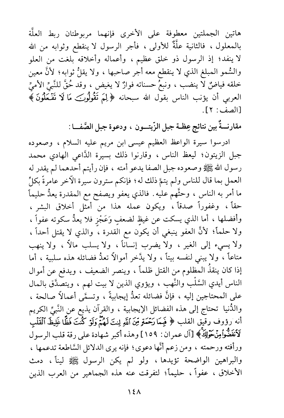 ادرسوا سيرة الواعظ العظيم عيسى ابن مريم عليه السلام، وصعوده جبل الزيتون؛ ليعظ الناس، وقارنوا ذلك بسيرة الدّاعي الهادي محمد رسول الله صلّى الله عليه وسلم وصعوده جبل الصفا يدعو أمته، فإن رأيتم أحدهما لم يقدر له العمل بما قال للناس ولم يتمّ ذلك له؛ فإنكم سترون سيرة الآخر عامرة بكلّ ما أمر به الناس، وحثّهم عليه. فالذي يعفو ويصفح مع المقدرة يعدّ حليما حقا، وغفورا صدقا، ويكون عمله هذا من أمثل أخلاق البشر، وأفضلها، أما الذي يسكت عن غيظ لضعف وعجز فلا يعدّ سكوته عفوا، ولا حلما؛ لأنّ العفو ينبغي أن يكون مع القدرة، والذي لا يقتل أحدا، ولا يسيء إلى الغير، ولا يضرب إنسانا، ولا يسلب مالا، ولا ينهب متاعا، ولا يا بني لنفسه بيتا، ولا يدّخر أموالا تعدّ فضائله هذه سلبية، أما إذا كان ينقذ المظلوم من القتل ظلما، وينصر الضعيف، ويدفع عن أموال الناس أيدي السّلب والنّهب، ويؤوي الذين لا بيت لهم، ويتصدّق بالمال على المحتاجين إليه، فإنّ فضائله تعدّ إيجابية، وتسمّى أعمالا صالحة، والدّنيا تحتاج إلى هذه الفضائل الإيجابية، والقرآن يذيع عن النّبيّ الكريم أنه رؤوف رقيق القلب فَبِما رَحْمَةٍ مِنَ اللَّهِ لِنْتَ لَهُمْ وَلَوْ كُنْتَ فَظًّا غَلِيظَ الْقَلْبِ لَانْفَضُّوا مِنْ حَوْلِكَ [آل عمران: 159] وهذه أكبر شهادة على رقة قلب الرسول ورأفته ورحمته، ومن زعم أنّها دعوى؛ فإنه يرى الدلائل السّاطعة تدعمها، والبراهين الواضحة تؤيدها، ولو لم يكن الرسول صلّى الله عليه وسلم لينا، دمث الأخلاق، عفوا، حليما؛ لتفرقت عنه هذه الجماهير من العرب الذين