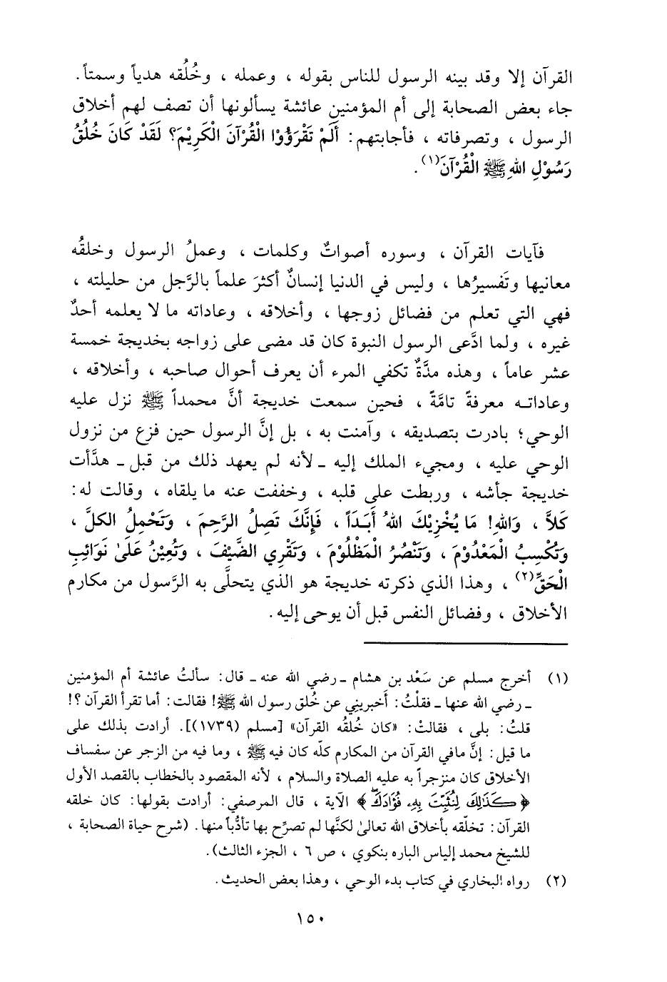 جاء بعض الصحابة إلى أم المؤمنين عائشة يسألونها أن تصف لهم أخلاق الرسول، وتصرفاته، فأجابتهم: ألم تقرؤوا القرآن الكريم؟ لقد كان خلق رسول الله صلّى الله عليه وسلم القرآن «1» .