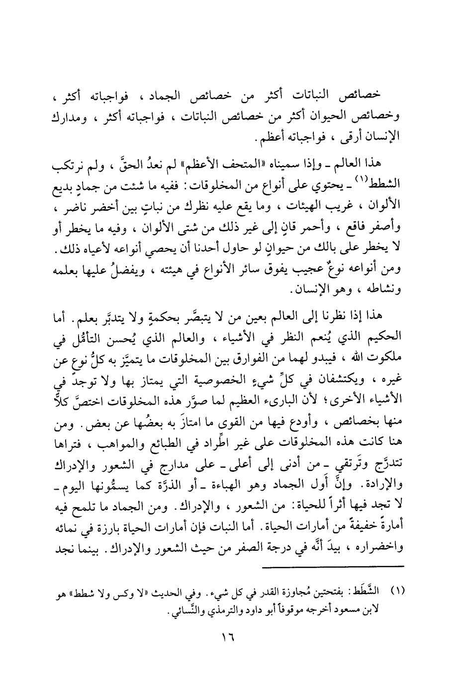 هذا العالم- وإذا سميناه «المتحف الأعظم» لم نعد الحقّ، ولم نرتكب الشطط «1» - يحتوي على أنواع من المخلوقات: ففيه ما شئت من جماد بديع الألوان، غريب الهيئات، وما يقع عليه نظرك من نبات بين أخضر ناضر، وأصفر فاقع، وأحمر قان إلى غير ذلك من شتى الألوان، وفيه ما يخطر أو لا يخطر على بالك من حيوان لو حاول أحدنا أن يحصي أنواعه لأعياه ذلك.