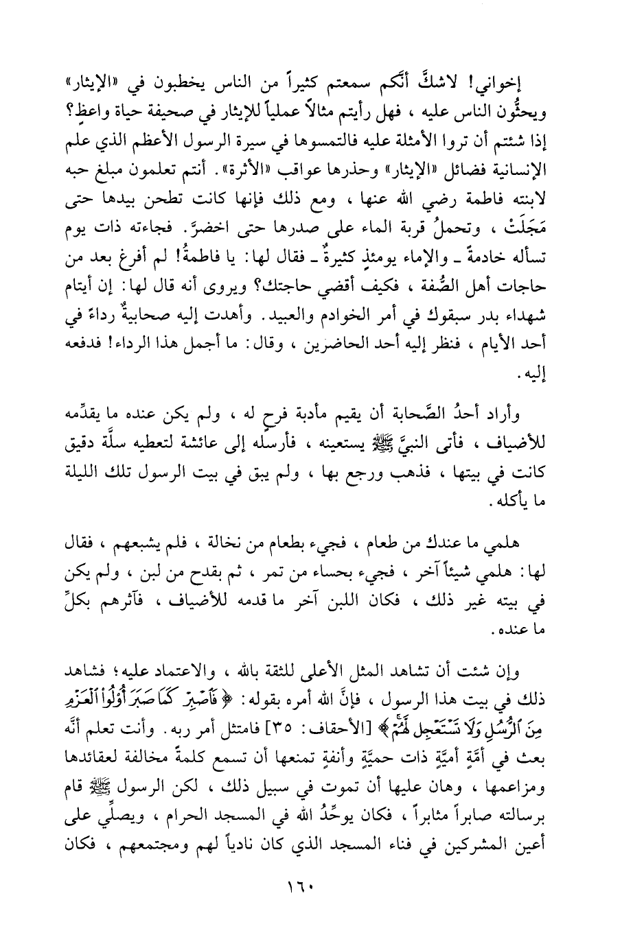 إذا شئتم أن تروا الأمثلة عليه فالتمسوها في سيرة الرسول الأعظم الذي علم الإنسانية فضائل «الإيثار» وحذرها عواقب «الأثرة» . أنتم تعلمون مبلغ حبه لابنته فاطمة رضي الله عنها، ومع ذلك فإنها كانت تطحن بيدها حتى مجلت، وتحمل قربة الماء على صدرها حتى اخضرّ. فجاءته ذات يوم تسأله خادمة- والإماء يومئذ كثيرة- فقال لها: يا فاطمة! لم أفرغ بعد من حاجات أهل الصّفة، فكيف أقضي حاجتك؟ ويروى أنه قال لها: إن أيتام شهداء بدر سبقوك في أمر الخوادم والعبيد. وأهدت إليه صحابية رداء في أحد الأيام، فنظر إليه أحد الحاضرين، وقال: ما أجمل هذا الرداء! فدفعه إليه.