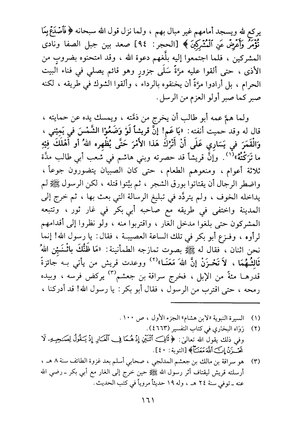 ولما همّ عمه أبو طالب أن يخرج من ذمّته، ويمسك يده عن حمايته، قال له وقد حميت أنفته: «يا عم! إنّ قريشا لو وضعوا الشّمس في يميني، والقمر في يساري على أن أترك هذا الأمر حتّى يظهره الله أو أهلك فيه ما تركته» «1» . وإنّ قريشا قد حصرته وبني هاشم في شعب أبي طالب مدّة ثلاثه أعوام، ومنعوهم الطعام، حتى كان الصبيان يتضورون جوعا، واضطر الرجال أن يقتاتوا بورق الشجر، ثم بيّتوا قتله، لكن الرسول صلّى الله عليه وسلم لم يداخله الخوف، ولم يتردّد في تبليغ الرسالة التي بعث بها، ثم خرج إلى المدينة واختفى في طريقه مع صاحبه أبي بكر في غار ثور، وتتبعه المشركون حتى بلغوا مدخل الغار، واقتربوا منه، ولو نظروا إلى أقدامهم لرأوه، وفزع أبو بكر في تلك الساعة العصيبة، فقال: يا رسول الله! إنما نحن اثنان، فقال له صلّى الله عليه وسلم بصوت تمازجه الطمأنينة: «ما ظنّك باثنين الله ثالثهما، لا تحزن إنّ الله معنا» «2» ووعدت قريش من يأتي به جائزة قدرها مئة من الإبل، فخرج سراقة بن جعشم «3» يركض فرسه، وبيده رمحه، حتى اقترب من الرسول، فقال أبو بكر: يا رسول الله! قد أدركنا،