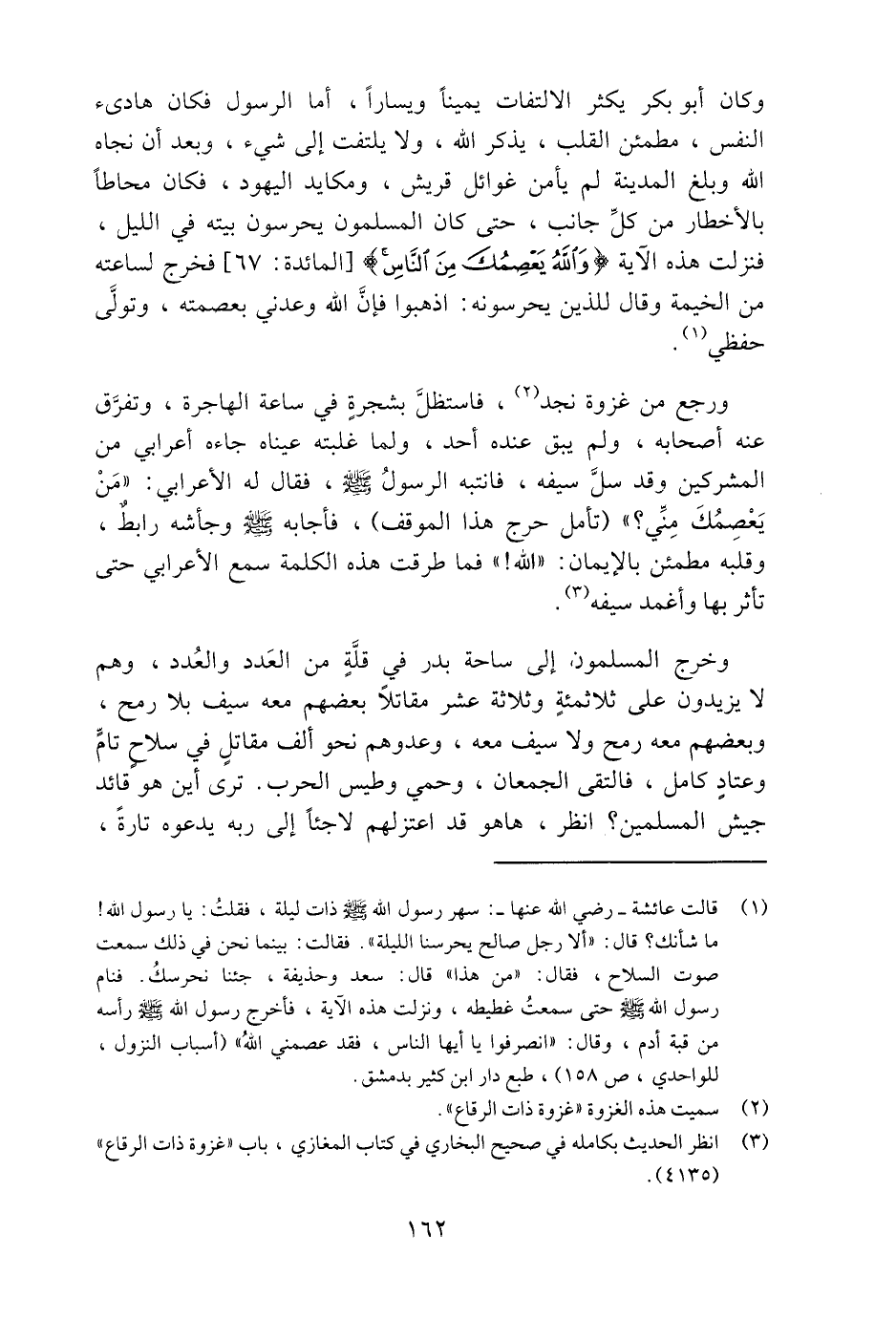 (1) قالت عائشة- رضي الله عنها-: سهر رسول الله صلّى الله عليه وسلم ذات ليلة، فقلت: يا رسول الله! ما شأنك؟ قال: «ألا رجل صالح يحرسنا الليلة» . فقالت: بينما نحن في ذلك سمعت صوت السلاح، فقال: «من هذا» قال: سعد وحذيفة، جئنا نحرسك. فنام رسول الله صلّى الله عليه وسلم حتى سمعت غطيطه، ونزلت هذه الآية، فأخرج رسول الله صلّى الله عليه وسلم رأسه من قبة أدم، وقال: «انصرفوا يا أيها الناس، فقد عصمني الله» (أسباب النزول، للواحدي، ص 158) ، طبع دار ابن كثير بدمشق.