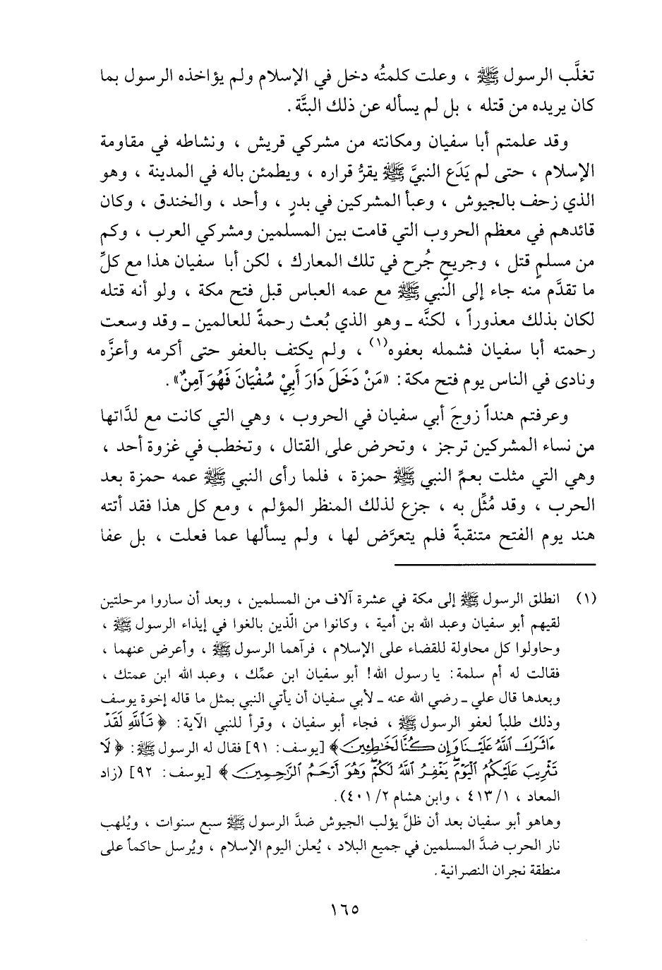 وقد علمتم أبا سفيان ومكانته من مشركي قريش، ونشاطه في مقاومة الإسلام، حتى لم يدع النبيّ صلّى الله عليه وسلم يقرّ قراره، ويطمئن باله في المدينة، وهو الذي زحف بالجيوش، وعبأ المشركين في بدر، وأحد، والخندق، وكان قائدهم في معظم الحروب التي قامت بين المسلمين ومشركي العرب، وكم من مسلم قتل، وجريح جرح في تلك المعارك، لكن أبا سفيان هذا مع كلّ ما تقدّم منه جاء إلى النبي صلّى الله عليه وسلم مع عمه العباس قبل فتح مكة، ولو أنه قتله لكان بذلك معذورا، لكنّه- وهو الذي بعث رحمة للعالمين- وقد وسعت رحمته أبا سفيان فشمله بعفوه «1» ، ولم يكتف بالعفو حتى أكرمه وأعزّه ونادى في الناس يوم فتح مكة: «من دخل دار أبي سفيان فهو آمن» .