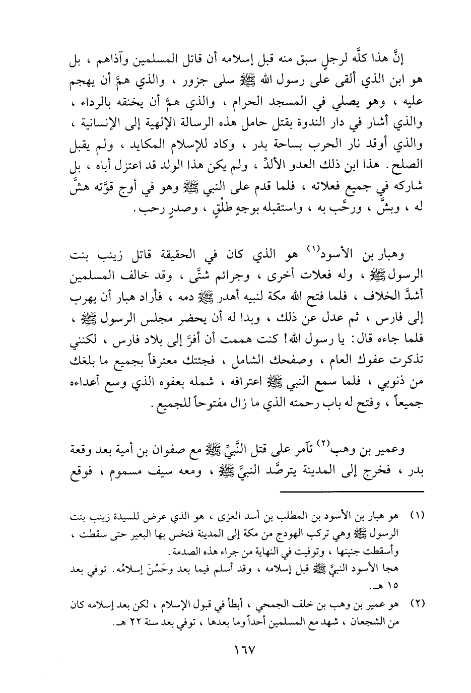 وهبار بن الأسود «1» هو الذي كان في الحقيقة قاتل زينب بنت الرسول صلّى الله عليه وسلم، وله فعلات أخرى، وجرائم شتّى، وقد خالف المسلمين أشدّ الخلاف، فلما فتح الله مكة لنبيه أهدر صلّى الله عليه وسلم دمه، فأراد هبار أن يهرب إلى فارس، ثم عدل عن ذلك، وبدا له أن يحضر مجلس الرسول صلّى الله عليه وسلم، فلما جاءه قال: يا رسول الله! كنت هممت أن أفرّ إلى بلاد فارس، لكنني تذكرت عفوك العام، وصفحك الشامل، فجئتك معترفا بجميع ما بلغك من ذنوبي، فلما سمع النبي صلّى الله عليه وسلم اعترافه، شمله بعفوه الذي وسع أعداءه جميعا، وفتح له باب رحمته الذي ما زال مفتوحا للجميع.
