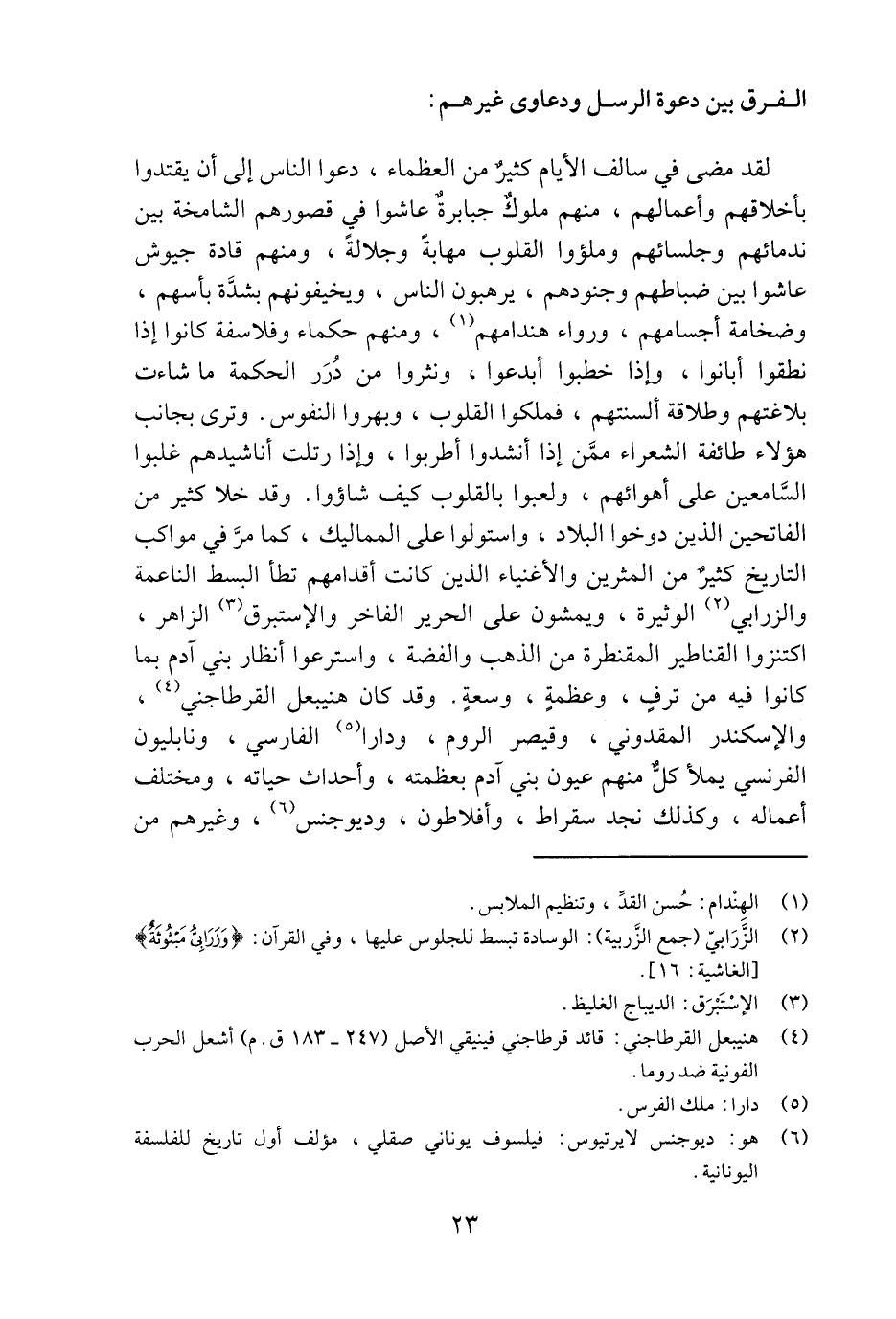 لقد مضى في سالف الأيام كثير من العظماء، دعوا الناس إلى أن يقتدوا بأخلاقهم وأعمالهم، منهم ملوك جبابرة عاشوا في قصورهم الشامخة بين ندمائهم وجلسائهم وملؤوا القلوب مهابة وجلالة، ومنهم قادة جيوش عاشوا بين ضباطهم وجنودهم، يرهبون الناس، ويخيفونهم بشدّة بأسهم، وضخامة أجسامهم، ورواء هندامهم «1» ، ومنهم حكماء وفلاسفة كانوا إذا نطقوا أبانوا، وإذا خطبوا أبدعوا، ونثروا من درر الحكمة ما شاءت بلاغتهم وطلاقة ألسنتهم، فملكوا القلوب، وبهروا النفوس. وترى بجانب هؤلاء طائفة الشعراء ممّن إذا أنشدوا أطربوا، وإذا رتلت أناشيدهم غلبوا السّامعين على أهوائهم، ولعبوا بالقلوب كيف شاؤوا. وقد خلا كثير من الفاتحين الذين دوخوا البلاد، واستولوا على المماليك، كما مرّ في مواكب التاريخ كثير من المثرين والأغنياء الذين كانت أقدامهم تطأ البسط الناعمة والزرابي «2» الوثيرة، ويمشون على الحرير الفاخر والإستبرق «3» الزاهر، اكتنزوا القناطير المقنطرة من الذهب والفضة، واسترعوا أنظار بني آدم بما كانوا فيه من ترف، وعظمة، وسعة. وقد كان هنيبعل القرطاجني «4» ، والإسكندر المقدوني، وقيصر الروم، ودارا «5» الفارسي، ونابليون الفرنسي يملأ كلّ منهم عيون بني آدم بعظمته، وأحداث حياته، ومختلف أعماله، وكذلك نجد سقراط، وأفلاطون، وديوجنس «6» ، وغيرهم من