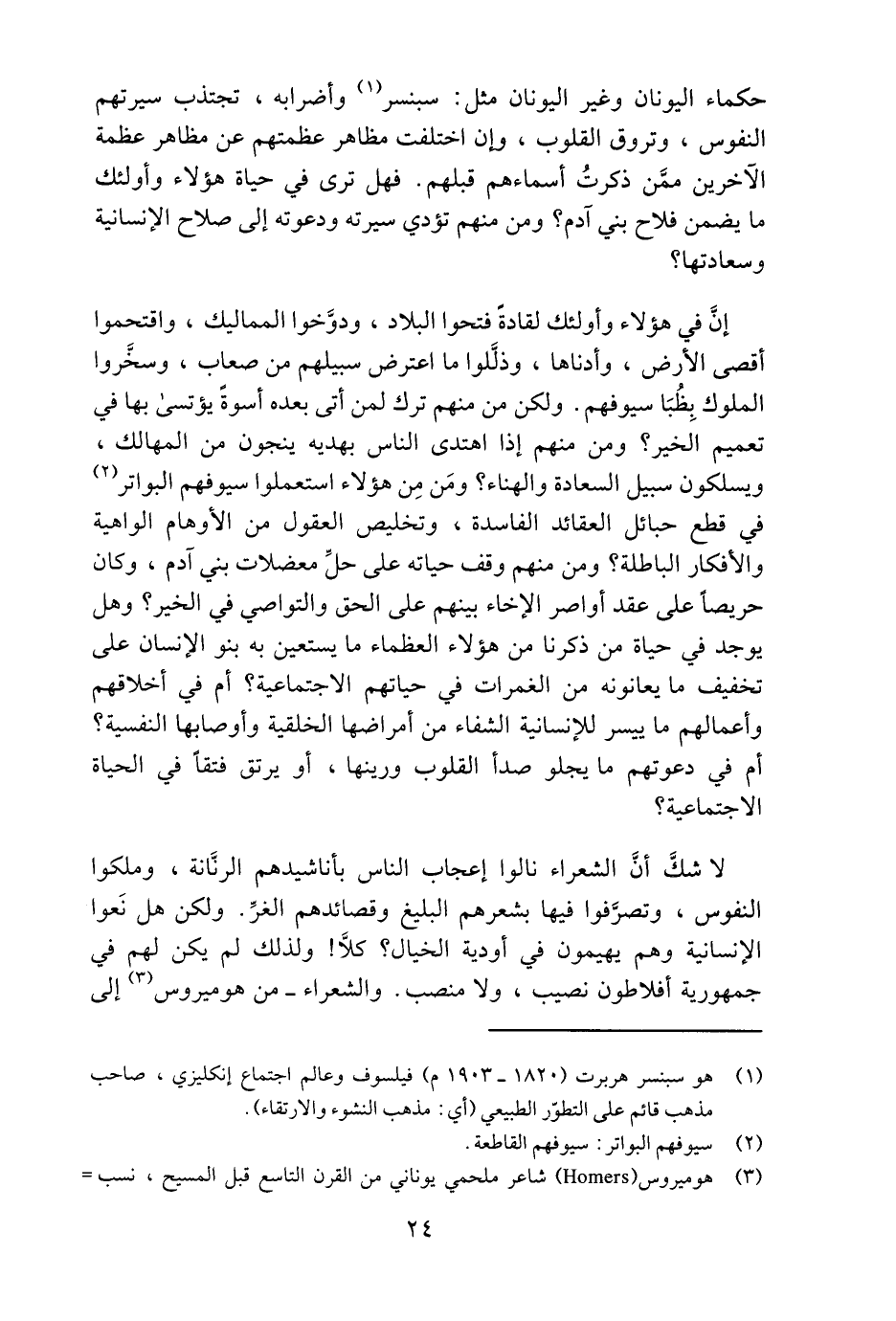 حكماء اليونان وغير اليونان مثل: سبنسر «1» وأضرابه، تجتذب سيرتهم النفوس، وتروق القلوب، وإن اختلفت مظاهر عظمتهم عن مظاهر عظمة الآخرين ممّن ذكرت أسماءهم قبلهم. فهل ترى في حياة هؤلاء وأولئك ما يضمن فلاح بني آدم؟ ومن منهم تؤدي سيرته ودعوته إلى صلاح الإنسانية وسعادتها؟