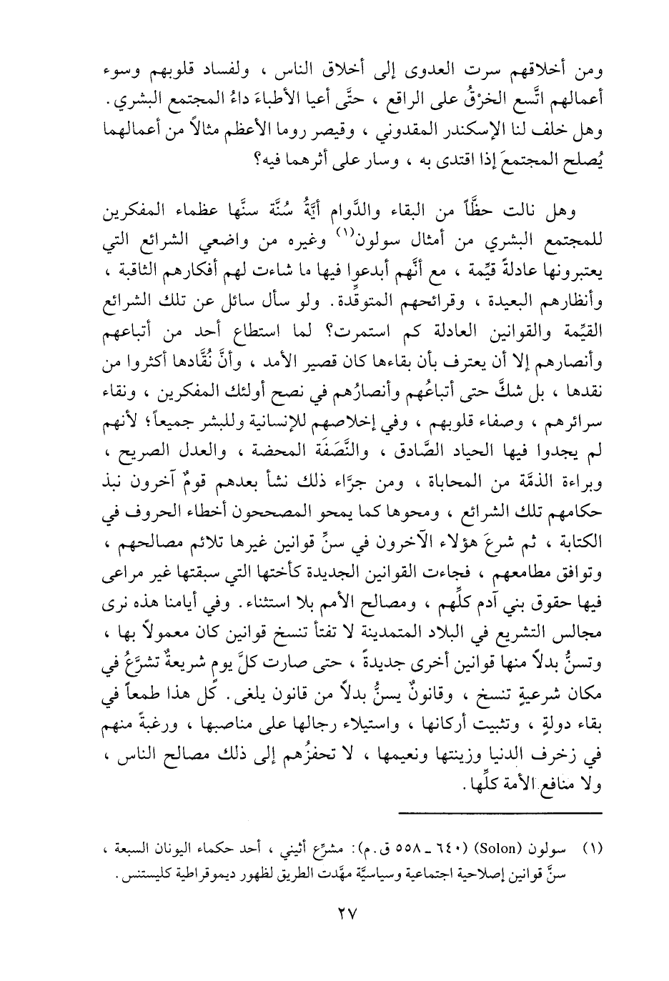 وهل نالت حظّا من البقاء والدّوام أيّة سنّة سنّها عظاماء المفكرين للمجتمع البشري من أمثال سولون «1» وغيره من واضعي الشرائع التي يعتبرونها عادلة قيّمة، مع أنّهم أبدعوا فيها ما شاءت لهم أفكارهم الثاقبة، وأنظارهم البعيدة، وقرائحهم المتوقّدة. ولو سأل سائل عن تلك الشرائع القيّمة والقوانين العادلة كم استمرت؟ لما استطاع أحد من أتباعهم وأنصارهم إلا أن يعترف بأن بقاءها كان قصير الأمد، وأنّ نقّادها أكثروا من نقدها، بل شكّ حتى أتباعهم وأنصارهم في نصح أولئك المفكرين، ونقاء سرائرهم، وصفاء قلوبهم، وفي إخلاصهم للإنسانية وللبشر جميعا؛ لأنهم لم يجدوا فيها الحياد الصّادق، والنّصفة المحضة، والعدل الصريح، وبراءة الذمّة من المحاباة، ومن جرّاء ذلك نشأ بعدهم قوم آخرون نبذ حكامهم تلك الشرائع، ومحوها كما يمحو المصححون أخطاء الحروف في الكتابة، ثم شرع هؤلاء الآخرون في سنّ قوانين غيرها تلائم مصالحهم، وتوافق مطامعهم، فجاءت القوانين الجديدة كأختها التي سبقتها غير مراعى فيها حقوق بني آدم كلّهم، ومصالح الأمم بلا استثناء. وفي أيامنا هذه نرى مجالس التشريع في البلاد المتمدينة لا تفتأ تنسخ قوانين كان معمولا بها، وتسنّ بدلا منها قوانين أخرى جديدة، حتى صارت كلّ يوم شريعة تشرّع في مكان شرعية تنسخ، وقانون يسنّ بدلا من قانون يلغى. كل هذا طمعا في بقاء دولة، وتثبيت أركانها، واستيلاء رجالها على مناصبها، ورغبة منهم في زخرف الدنيا وزينتها ونعيمها، لا تحفزهم إلى ذلك مصالح الناس، ولا منافع الأمة كلّها.