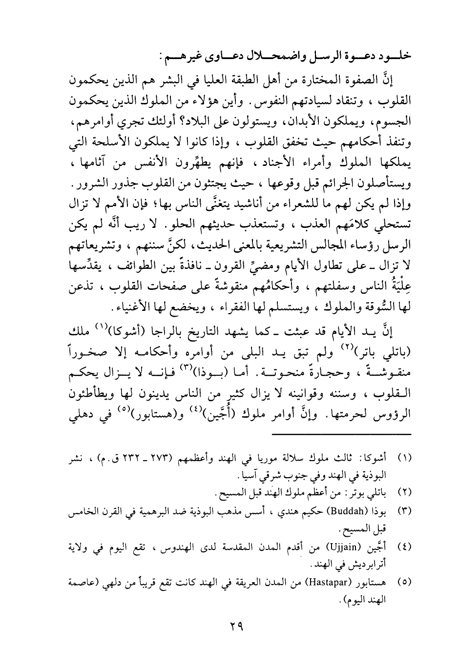 إنّ يد الأيام قد عبثت- كما يشهد التاريخ بالراجا (أشوكا) «1» ملك (باتلي باتر) «2» ولم تبق يد البلى من أوامره وأحكامه إلا صخورا منقوشة، وحجارة منحوتة. أما (بوذا) «3» فإنه لا يزال يحكم القلوب، وسننه وقوانينه لا يزال كثير من الناس يدينون لها ويطأطئون الرؤوس لحرمتها. وإنّ أوامر ملوك (أجّين) «4» و (هستابور) «5» في دهلي