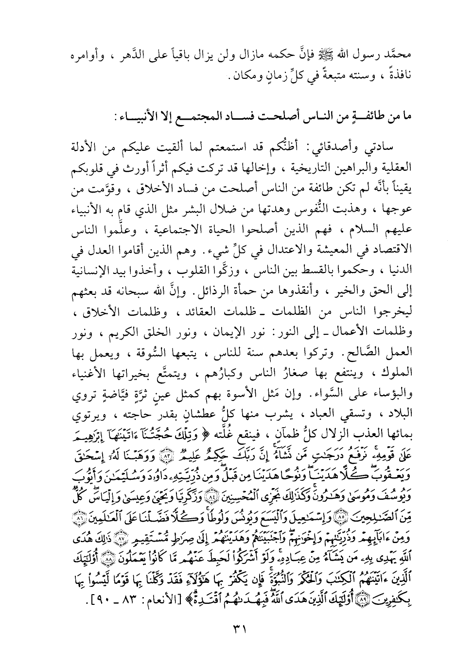 سادتي وأصدقائي: أظنّكم قد استمعتم لما ألقيت عليكم من الأدلة العقلية والبراهين التاريخية، وإخالها قد تركت فيكم أثرا أورث في قلوبكم يقينا بأنّه لم تكن طائفة من الناس أصلحت من فساد الأخلاق، وقوّمت من عوجها، وهذبت النّفوس وهدتها من ضلال البشر مثل الذي قام به الأنبياء عليهم السلام، فهم الذين أصلحوا الحياة الاجتماعية، وعلّموا الناس الاقتصاد في المعيشة والاعتدال في كلّ شيء. وهم الذين أقاموا العدل في الدنيا، وحكموا بالقسط بين الناس، وزكّوا القلوب، وأخذوا بيد الإنسانية إلى الحق والخير، وأنقذوها من حمأة الرذائل. وإنّ الله سبحانه قد بعثهم ليخرجوا الناس من الظلمات- ظلمات العقائد، وظلمات الأخلاق، وظلمات الأعمال- إلى النور: نور الإيمان، ونور الخلق الكريم، ونور العمل الصّالح. وتركوا بعدهم سنة للناس، يتبعها السّوقة، ويعمل بها الملوك، وينتفع بها صغار الناس وكبارهم، ويتمتّع بخيراتها الأغنياء والبؤساء على السّواء. وإن مثل الأسوة بهم كمثل عين ثرّة فيّاضة تروي البلاد، وتسقي العباد، يشرب منها كلّ عطشان بقدر حاجته، ويرتوي بمائها العذب الزلال كلّ ظمان، فينقع غلّته وَتِلْكَ حُجَّتُنا آتَيْناها إِبْراهِيمَ عَلى قَوْمِهِ نَرْفَعُ دَرَجاتٍ مَنْ نَشاءُ إِنَّ رَبَّكَ حَكِيمٌ عَلِيمٌ (83) وَوَهَبْنا لَهُ إِسْحاقَ وَيَعْقُوبَ كُلًّا هَدَيْنا وَنُوحاً هَدَيْنا مِنْ قَبْلُ وَمِنْ ذُرِّيَّتِهِ داوُدَ وَسُلَيْمانَ وَأَيُّوبَ وَيُوسُفَ وَمُوسى وَهارُونَ وَكَذلِكَ نَجْزِي الْمُحْسِنِينَ (84) وَزَكَرِيَّا وَيَحْيى وَعِيسى وَإِلْياسَ كُلٌّ مِنَ الصَّالِحِينَ (85) وَإِسْماعِيلَ وَالْيَسَعَ وَيُونُسَ وَلُوطاً وَكلًّا فَضَّلْنا عَلَى الْعالَمِينَ (86) وَمِنْ آبائِهِمْ وَذُرِّيَّاتِهِمْ وَإِخْوانِهِمْ وَاجْتَبَيْناهُمْ وَهَدَيْناهُمْ إِلى صِراطٍ مُسْتَقِيمٍ (87) ذلِكَ هُدَى اللَّهِ يَهْدِي بِهِ مَنْ يَشاءُ مِنْ عِبادِهِ وَلَوْ أَشْرَكُوا لَحَبِطَ عَنْهُمْ ما كانُوا يَعْمَلُونَ (88) أُولئِكَ الَّذِينَ آتَيْناهُمُ الْكِتابَ وَالْحُكْمَ وَالنُّبُوَّةَ فَإِنْ يَكْفُرْ بِها هؤُلاءِ فَقَدْ وَكَّلْنا بِها قَوْماً لَيْسُوا بِها بِكافِرِينَ (89) أُولئِكَ الَّذِينَ هَدَى اللَّهُ فَبِهُداهُمُ اقْتَدِهْ [الأنعام: 83- 90] .
