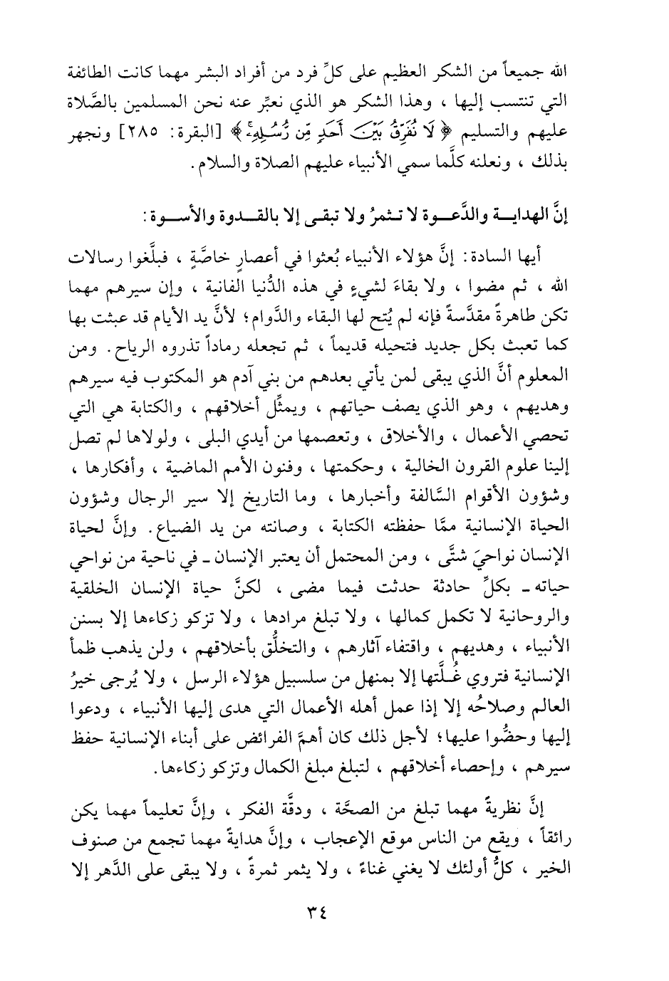 أيها السادة: إنّ هؤلاء الأنبياء بعثوا في أعصار خاصّة، فبلّغوا رسالات الله، ثم مضوا، ولا بقاء لشيء في هذه الدّنيا الفانية، وإن سيرهم مهما تكن طاهرة مقدّسة فإنه لم يتح لها البقاء والدّوام؛ لأنّ يد الأيام قد عبثت بها كما تعبث بكل جديد فتحيله قديما، ثم تجعله رمادا تذروه الرياح. ومن المعلوم أنّ الذي يبقى لمن يأتي بعدهم من بني آدم هو المكتوب فيه سيرهم وهداهم، وهو الذي يصف حياتهم، ويمثّل أخلاقهم، والكتابة هي التي تحصي الأعمال، والأخلاق، وتعصمها من أيدي البلى، ولولاها لم تصل إلينا علوم القرون الخالية، وحكمتها، وفنون الأمم الماضية، وأفكارها، وشؤون الأقوام السّالفة وأخبارها، وما التاريخ إلا سير الرجال وشؤون الحياة الإنسانية ممّا حفظته الكتابة، وصانته من يد الضياع. وإنّ لحياة الإنسان نواحي شتّى، ومن المحتمل أن يعتبر الإنسان- في ناحية من نواحي حياته- بكلّ حادثة حدثت فيما مضى، لكنّ حياة الإنسان الخلقية والروحانية لا تكمل كمالها، ولا تبلغ مرادها، ولا تزكو زكاءها إلا بسنن الأنبياء، وهداهم، واقتفاء آثارهم، والتخلّق بأخلاقهم، ولن يذهب ظمأ الإنسانية فتروي غلّتها إلا بمنهل من سلسبيل هؤلاء الرسل، ولا يرجى خير العالم وصلاحه إلا إذا عمل أهله الأعمال التي هدى إليها الأنبياء، ودعوا إليها وحضّوا عليها؛ لأجل ذلك كان أهمّ الفرائض على أبناء الإنسانية حفظ سيرهم، وإحصاء أخلاقهم، لتبلغ مبلغ الكمال وتزكو زكاءها.