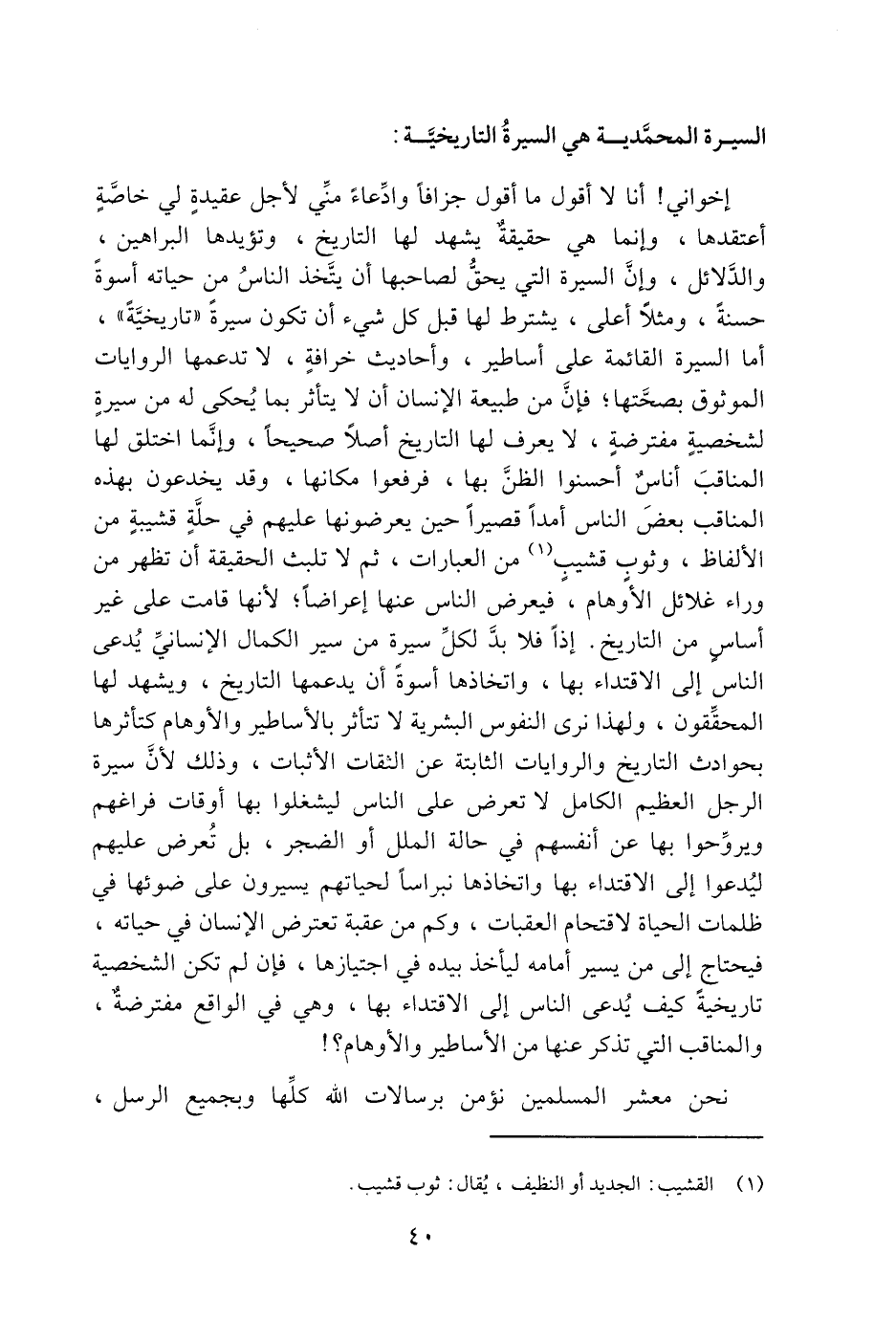 إخواني! أنا لا أقول ما أقول جزافا وادّعاء منّي لأجل عقيدة لي خاصّة أعتقدها، وإنما هي حقيقة يشهد لها التاريخ، وتؤيدها البراهين، والدّلائل، وإنّ السيرة التي يحقّ لصاحبها أن يتّخذ الناس من حياته أسوة حسنة، ومثلا أعلى، يشترط لها قبل كل شيء أن تكون سيرة «تاريخيّة» ، أما السيرة القائمة على أساطير، وأحاديث خرافة، لا تدعمها الروايات الموثوق بصحّتها؛ فإنّ من طبيعة الإنسان ألايتأثر بما يحكى له من سيرة لشخصية مفترضة، لا يعرف لها التاريخ أصلا صحيحا، وإنّما اختلق لها المناقب أناس أحسنوا الظنّ بها، فرفعوا مكانها، وقد يخدعون بهذه المناقب بعض الناس أمدا قصيرا حين يعرضونها عليهم في حلّة قشيبة من الألفاظ، وثوب قشيب «1» من العبارات، ثم لا تلبث الحقيقة أن تظهر من وراء غلائل الأوهام، فيعرض الناس عنها إعراضا؛ لأنها قامت على غير أساس من التاريخ. إذا فلا بدّ لكلّ سيرة من سير الكمال الإنسانيّ يدعى الناس إلى الاقتداء بها، واتخاذها أسوة أن يدعمها التاريخ، ويشهد لها المحقّقون، ولهذا نرى النفوس البشرية لا تتأثر بالأساطير والأوهام كتأثرها بحوادث التاريخ والروايات الثابتة عن الثقات الأثبات، وذلك لأنّ سيرة الرجل العظيم الكامل لا تعرض على الناس ليشغلوا بها أوقات فراغهم ويروّحوا بها عن أنفسهم في حالة الملل أو الضجر، بل تعرض عليهم ليدعوا إلى الاقتداء بها واتخاذها نبراسا لحياتهم يسيرون على ضوئها في ظلمات الحياة لاقتحام العقبات، وكم من عقبة تعترض الإنسان في حياته، فيحتاج إلى من يسير أمامه ليأخذ بيده في اجتيازها، فإن لم تكن الشخصية تاريخية كيف يدعى الناس إلى الاقتداء بها، وهي في الواقع مفترضة، والمناقب التي تذكر عنها من الأساطير والأوهام؟!