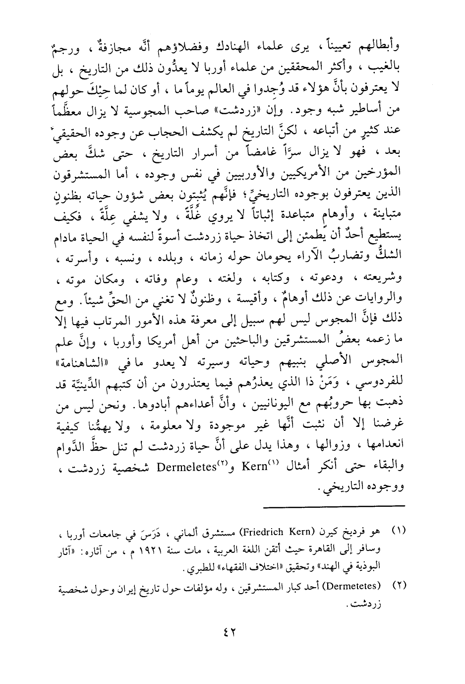 وأبطالهم تعيينا، يرى علماء الهنادك وفضلاؤهم أنّه مجازفة، ورجم بالغيب، وأكثر المحققين من علماء أوربا لا يعدّون ذلك من التاريخ، بل لا يعترفون بأنّ هؤلاء قد وجدوا في العالم يوما ما، أو كان لما حيك حولهم من أساطير شبه وجود. وإن «زردشت» صاحب المجوسية لا يزال معظّما عند كثير من أتباعه، لكنّ التاريخ لم يكشف الحجاب عن وجوده الحقيقي بعد، فهو لا يزال سرّا غامضا من أسرار التاريخ، حتى شكّ بعض المؤرخين من الأمريكيين والأوربيين في نفس وجوده، أما المستشرقون الذين يعترفون بوجوده التاريخيّ؛ فإنّهم يثبتون بعض شؤون حياته بظنون متباينة، وأوهام متباعدة إثباتا لا يروي غلّة، ولا يشفي علّة، فكيف يستطيع أحد أن يطمئن إلى اتخاذ حياة زردشت أسوة لنفسه في الحياة مادام الشكّ وتضارب الآراء يحومان حوله زمانه، وبلده، ونسبه، وأسرته، وشريعته، ودعوته، وكتابه، ولغته، وعام وفاته، ومكان موته، والروايات عن ذلك أوهام، وأقيسة، وظنون لا تغني من الحقّ شيئا. ومع ذلك فإنّ المجوس ليس لهم سبيل إلى معرفة هذه الأمور المرتاب فيها إلا ما زعمه بعض المستشرقين والباحثين من أهل أمريكا وأوربا، وإنّ علم المجوس الأصلي بنبيهم وحياته وسيرته لا يعدو ما في «الشاهنامة» للفردوسي، ومن ذا الذي يعذرهم فيما يعتذرون من أن كتبهم الدّينيّة قد ذهبت بها حروبهم مع اليونانيين، وأنّ أعداءهم أبادوها. ونحن ليس من غرضنا إلا أن نثبت أنّها غير موجودة ولا معلومة، ولا يهمّنا كيفية انعدامها، وزوالها، وهذا يدل على أنّ حياة زردشت لم تنل حظّ الدّوام والبقاء حتى أنكر أمثال Kern «1» و «2» Dermeletes وشخصية زردشت، ووجوده التاريخي.
