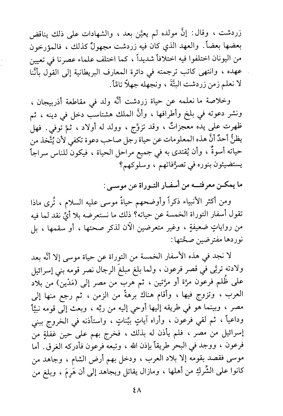 وخلاصة ما نعلمه عن حياة زردشت أنّه ولد في مقاطعة أذربيجان، ونشر دعوته في بلخ وأطرافها، وأنّ الملك هشتاسب دخل في دينه، ثم ظهرت على يده معجزات، وقد تزوّج، وولد له أولاد، ثمّ توفي. فهل يظنّ أحد أنّ هذه المعلومات عن حياة رجل صاحب دعوة تكفي لأن يتّخذ من حياته أسوة، وأن يقتدى به في جميع مراحل الحياة، فيكون للناس سراجا يستضيئون بنوره في تصرّفاتهم، وسلوكهم؟