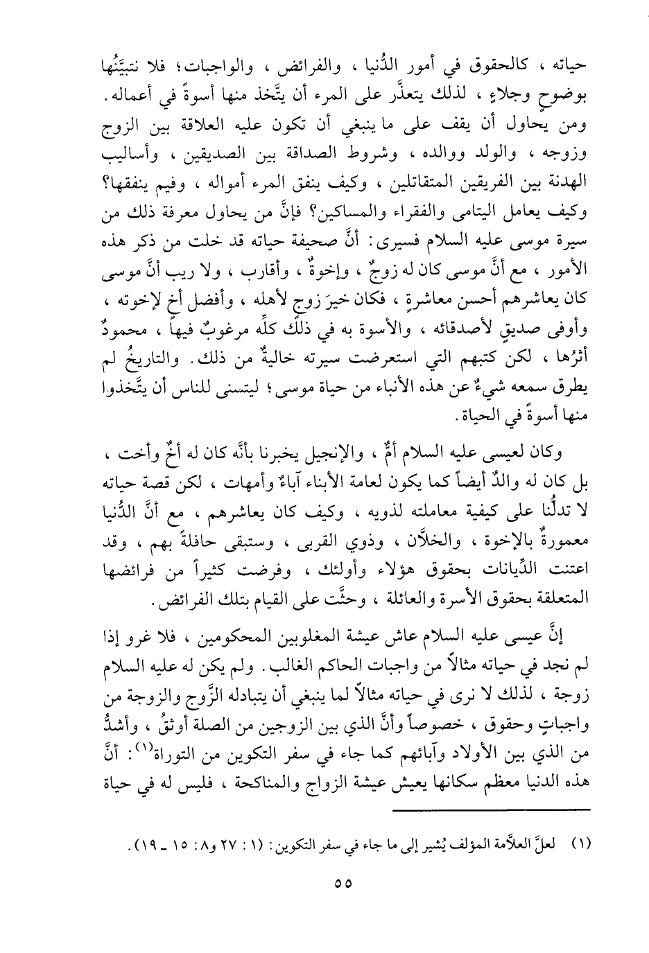 إنّ عيسى عليه السلام عاش عيشة المغلوبين المحكومين، فلا غرو إذا لم نجد في حياته مثالا من واجبات الحاكم الغالب. ولم يكن له عليه السلام زوجة، لذلك لا نرى في حياته مثالا لما ينبغي أن يتبادله الزّوج والزوجة من واجبات وحقوق، خصوصا وأنّ الذي بين الزوجين من الصلة أوثق، وأشدّ من الذي بين الأولاد وآبائهم كما جاء في سفر التكوين من التوراة «1» : أنّ هذه الدنيا معظم سكانها يعيش عيشة الزواج والمناكحة، فليس له في حياة