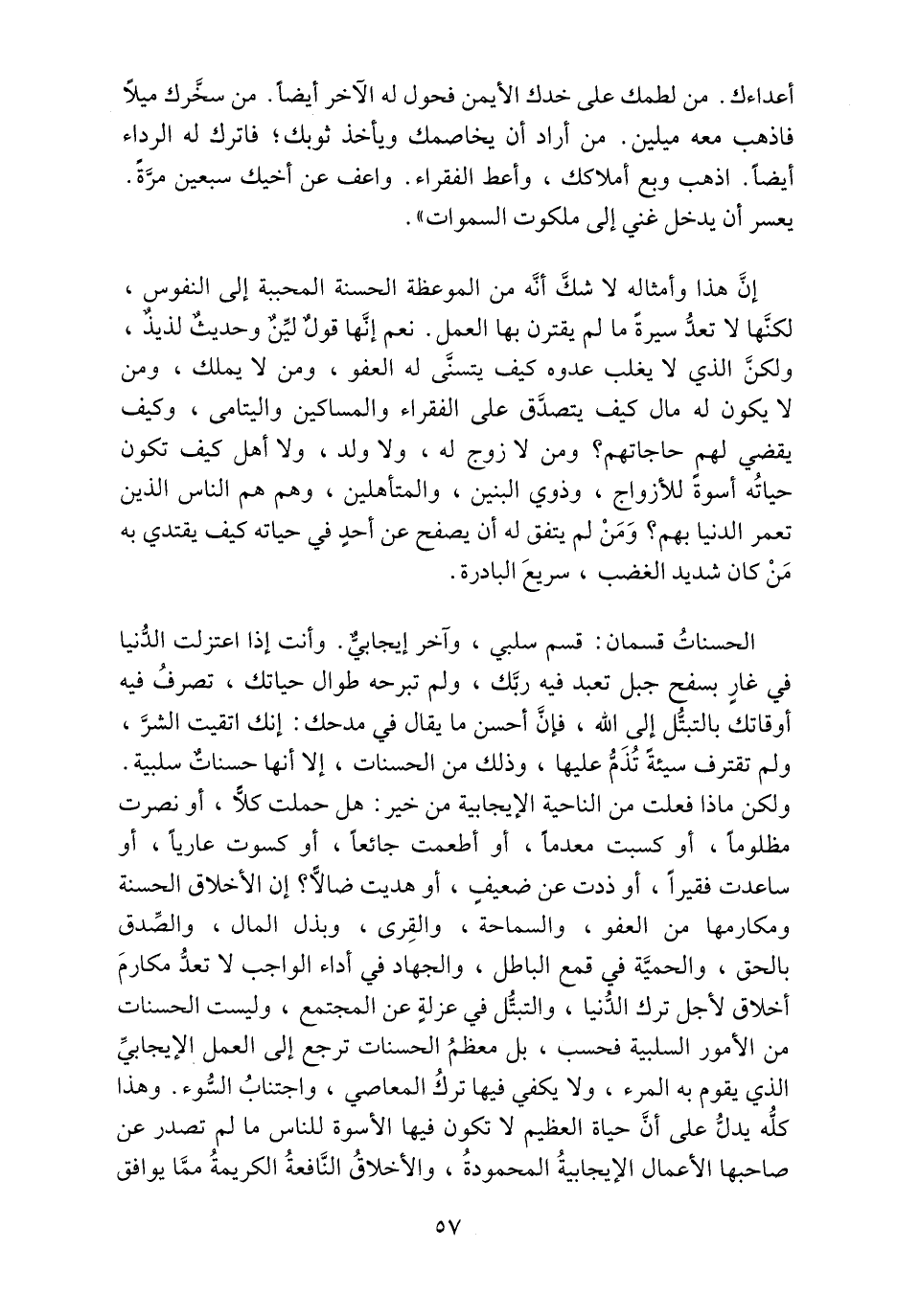 ولكن ماذا فعلت من الناحية الإيجابية من خير: هل حملت كلّا، أو نصرت مظلوما، أو كسبت معدما، أو أطعمت جائعا، أو كسوت عاريا، أو ساعدت فقيرا، أو ذدت عن ضعيف، أو هديت ضالّا؟ إن الأخلاق الحسنة ومكارمها من العفو، والسماحة، والقرى، وبذل المال، والصّدق بالحق، والحميّة في قمع الباطل، والجهاد في أداء الواجب لا تعدّ مكارم أخلاق لأجل ترك الدّنيا، والتبتّل في عزلة عن المجتمع، وليست الحسنات من الأمور السلبية فحسب، بل معظم الحسنات ترجع إلى العمل الإيجابيّ الذي يقوم به المرء، ولا يكفي فيها ترك المعاصي، واجتناب السّوء. وهذا كلّه يدلّ على أنّ حياة العظيم لا تكون فيها الأسوة للناس ما لم تصدر عن صاحبها الأعمال الإيجابية المحمودة، والأخلاق النّافعة الكريمة ممّا يوافق