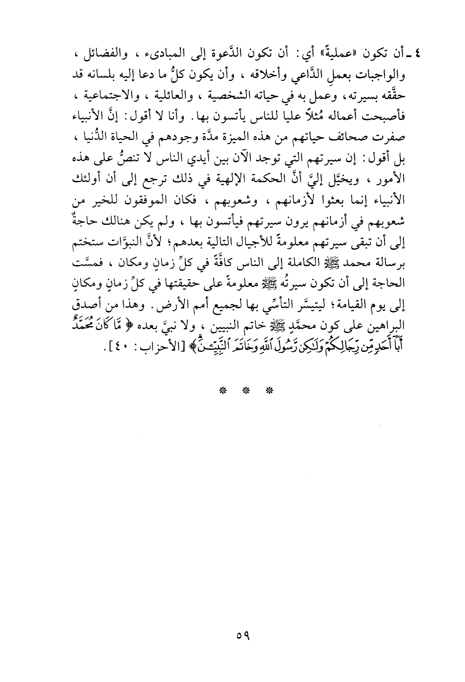 4- أن تكون «عملية» أي: أن تكون الدّعوة إلى المبادىء، والفضائل، والواجبات بعمل الدّاعي وأخلاقه، وأن يكون كلّ ما دعا إليه بلسانه قد حقّقه بسيرته، وعمل به في حياته الشخصية، والعائلية، والاجتماعية، فأصبحت أعماله مثلا عليا للناس يأتسون بها. وأنا لا أقول: إنّ الأنبياء صفرت صحائف حياتهم من هذه الميزة مدّة وجودهم في الحياة الدّنيا، بل أقول: إن سيرتهم التي توجد الآن بين أيدي الناس لا تنصّ على هذه الأمور، ويخيّل إليّ أنّ الحكمة الإلهية في ذلك ترجع إلى أن أولئك الأنبياء إنما بعثوا لأزمانهم، وشعوبهم، فكان الموفقون للخير من شعوبهم في أزمانهم يرون سيرتهم فيأتسون بها، ولم يكن هنالك حاجة إلى أن تبقى سيرتهم معلومة للأجيال التالية بعدهم؛ لأنّ النبوّات ستختم برسالة محمد صلّى الله عليه وسلم الكاملة إلى الناس كافّة في كلّ زمان ومكان، فمسّت الحاجة إلى أن تكون سيرته صلّى الله عليه وسلم معلومة على حقيقتها في كلّ زمان ومكان إلى يوم القيامة؛ ليتيسّر التأسّي بها لجميع أمم الأرض. وهذا من أصدق البراهين على كون محمّد صلّى الله عليه وسلم خاتم النبيين، ولا نبيّ بعده ما كانَ مُحَمَّدٌ أَبا أَحَدٍ مِنْ رِجالِكُمْ وَلكِنْ رَسُولَ اللَّهِ وَخاتَمَ النَّبِيِّينَ [الأحزاب: 40] .