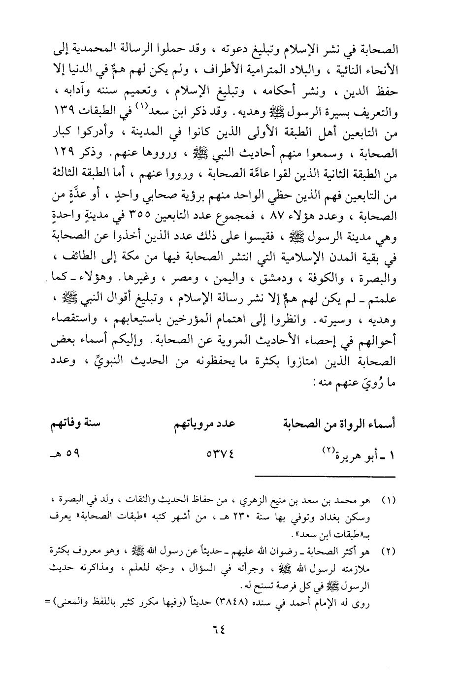 الصحابة في نشر الإسلام وتبليغ دعوته، وقد حملوا الرسالة المحمدية إلى الأنحاء النائية، والبلاد المترامية الأطراف، ولم يكن لهم همّ في الدنيا إلا حفظ الدين، ونشر أحكامه، وتبليغ الإسلام، وتعميم سننه وآدابه، والتعريف بسيرة الرسول صلّى الله عليه وسلم وهديه. وقد ذكر ابن سعد «1» في الطبقات 139 من التابعين أهل الطبقة الأولى الذين كانوا في المدينة، وأدركوا كبار الصحابة، وسمعوا منهم أحاديث النبي صلّى الله عليه وسلم، ورووها عنهم. وذكر 129 من الطبقة الثانية الذين لقوا عامّة الصحابة، ورووا عنهم، أما الطبقة الثالثة من التابعين فهم الذين حظي الواحد منهم برؤية صحابي واحد، أو عدّة من الصحابة، وعدد هؤلاء 87، فمجموع عدد التابعين 355 في مدينة واحدة وهي مدينة الرسول صلّى الله عليه وسلم، فقيسوا على ذلك عدد الذين أخذوا عن الصحابة في بقية المدن الإسلامية التي انتشر الصحابة فيها من مكة إلى الطائف، والبصرة، والكوفة، ودمشق، واليمن، ومصر، وغيرها. وهؤلاء- كما علمتم- لم يكن لهم همّ إلا نشر رسالة الإسلام، وتبليغ أقوال النبي صلّى الله عليه وسلم، وهديه، وسيرته. وانظروا إلى اهتمام المؤرخين باستيعابهم، واستقصاء أحوالهم في إحصاء الأحاديث المروية عن الصحابة. وإليكم أسماء بعض الصحابة الذين امتازوا بكثرة ما يحفظونه من الحديث النبويّ، وعدد ما روي عنهم منه:
