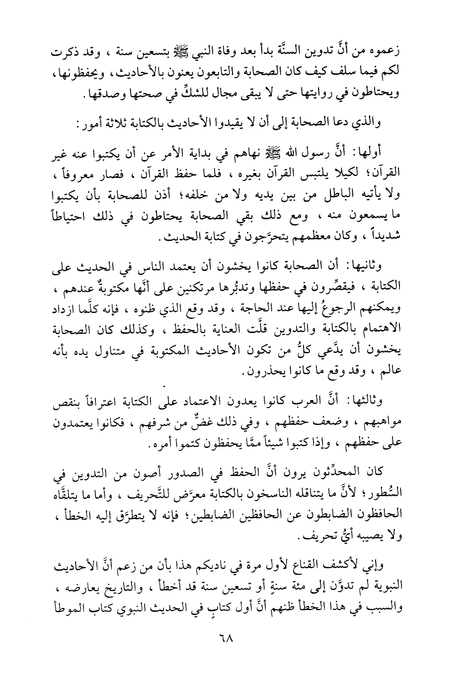 وإني لأكشف القناع لأول مرة في ناديكم هذا بأن من زعم أنّ الأحاديث النبوية لم تدوّن إلى مئة سنة أو تسعين سنة قد أخطأ، والتاريخ يعارضه، والسبب في هذا الخطأ ظنهم أنّ أول كتاب في الحديث النبوي كتاب الموطأ