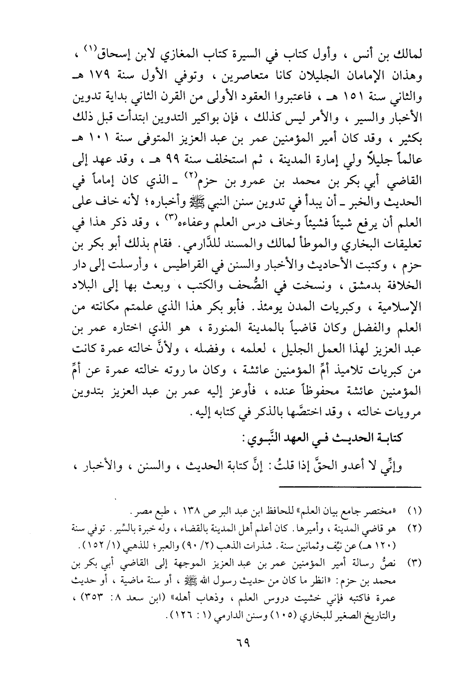 (3) نصّ رسالة أمير المؤمنين عمر بن عبد العزيز الموجهة إلى القاضي أبي بكر بن محمد بن حزم: «انظر ما كان من حديث رسول الله صلّى الله عليه وسلم، أو سنة ماضية، أو حديث عمرة فاكتبه فإني خشيت دروس العلم، وذهاب أهله» (ابن سعد 8: 353) ، والتاريخ الصغير للبخاري (105) وسنن الدارمي (1: 126) .