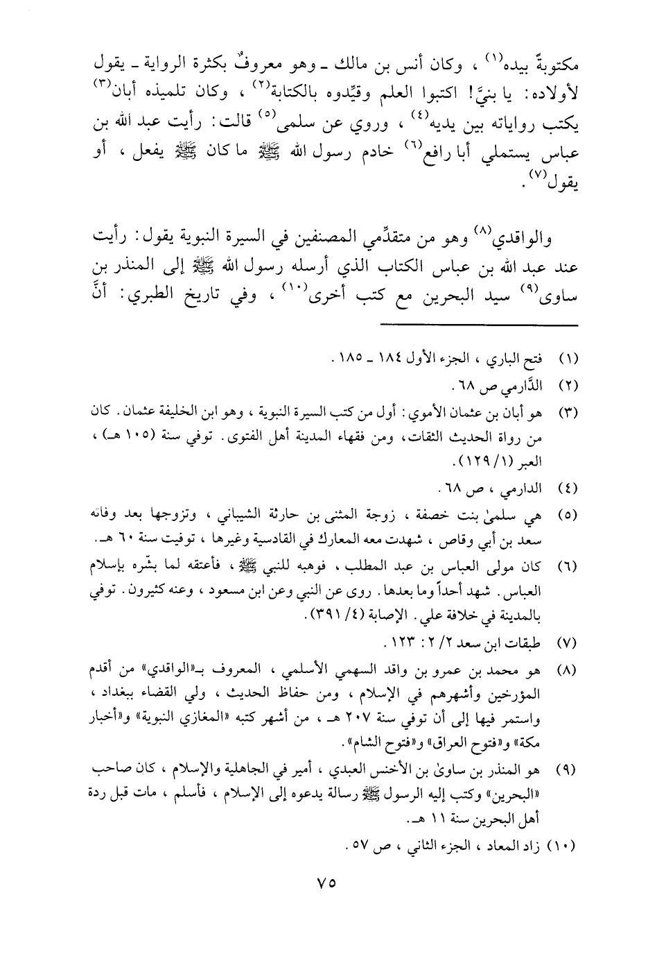 والواقدي «8» وهو من متقدّمي المصنفين في السيرة النبوية يقول: رأيت عند عبد الله بن عباس الكتاب الذي أرسله رسول الله صلّى الله عليه وسلم إلى المنذر بن ساوى «9» سيد البحرين مع كتب أخرى «10» ، وفي تاريخ الطبري: أنّ