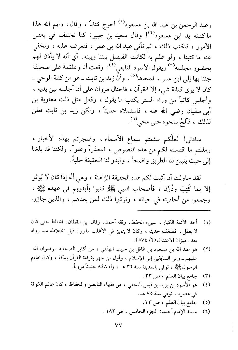 وعبد الرحمن بن عبد الله بن مسعود «1» أخرج كتابا، وقال: وايم الله هذا ما كتبته يد ابن مسعود «2» ! وقال سعيد بن جبير: كنا نختلف في بعض الأمور، فنكتب ذلك، ثم نأتي عبد الله بن عمر، فنعرضه عليه، ونخفي عنه ما كتبنا، ولو علم به لكانت الفيصل بيننا وبينه. أي أنه لا يأذن لهم بحضور مجلسه «3» ويقول الأسود التابعي «4» : وقعت أنا وعلقمة على صحيفة جئنا بها إلى ابن عمر، فمحاها «5» . وأنّ زيد بن ثابت- هو من كتبة الوحي- كان لا يرى كتابة شيء إلا القرآن، فاحتال مروان على أن أجلسه بين يديه، وأجلس كاتبا من وراء الستر يكتب ما يقول، وفعل مثل ذلك معاوية بن أبي سفيان رضي الله عنه، فاستملاه حديثا، ولكن زيد بن ثابت فطن لذلك، فألحّ بمحوه حتى محي «6» .