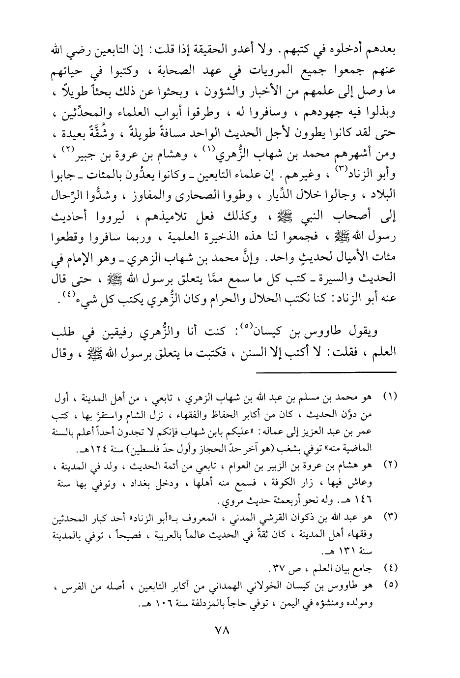 بعدهم أدخلوه في كتبهم. ولا أعدو الحقيقة إذا قلت: إن التابعين رضي الله عنهم جمعوا جميع المرويات في عهد الصحابة، وكتبوا في حياتهم ما وصل إلى علمهم من الأخبار والشؤون، وبحثوا عن ذلك بحثا طويلا، وبذلوا فيه جهودهم، وسافروا له، وطرقوا أبواب العلماء والمحدّثين، حتى لقد كانوا يطوون لأجل الحديث الواحد مسافة طويلة، وشقّة بعيدة، ومن أشهرهم محمد بن شهاب الزّهري «1» ، وهشام بن عروة بن جبير «2» ، وأبو الزناد «3» ، وغيرهم. إن علماء التابعين- وكانوا يعدّون بالمئات- جابوا البلاد، وجالوا خلال الدّيار، وطووا الصحارى والمفاوز، وشدّوا الرّحال إلى أصحاب النبي صلّى الله عليه وسلم، وكذلك فعل تلاميذهم، ليرووا أحاديث رسول الله صلّى الله عليه وسلم، فجمعوا لنا هذه الذخيرة العلمية، وربما سافروا وقطعوا مئات الأميال لحديث واحد. وإنّ محمد بن شهاب الزهري- وهو الإمام في الحديث والسيرة- كتب كل ما سمع ممّا يتعلق برسول الله صلّى الله عليه وسلم، حتى قال عنه أبو الزناد: كنا نكتب الحلال والحرام وكان الزّهري يكتب كل شيء «4» .