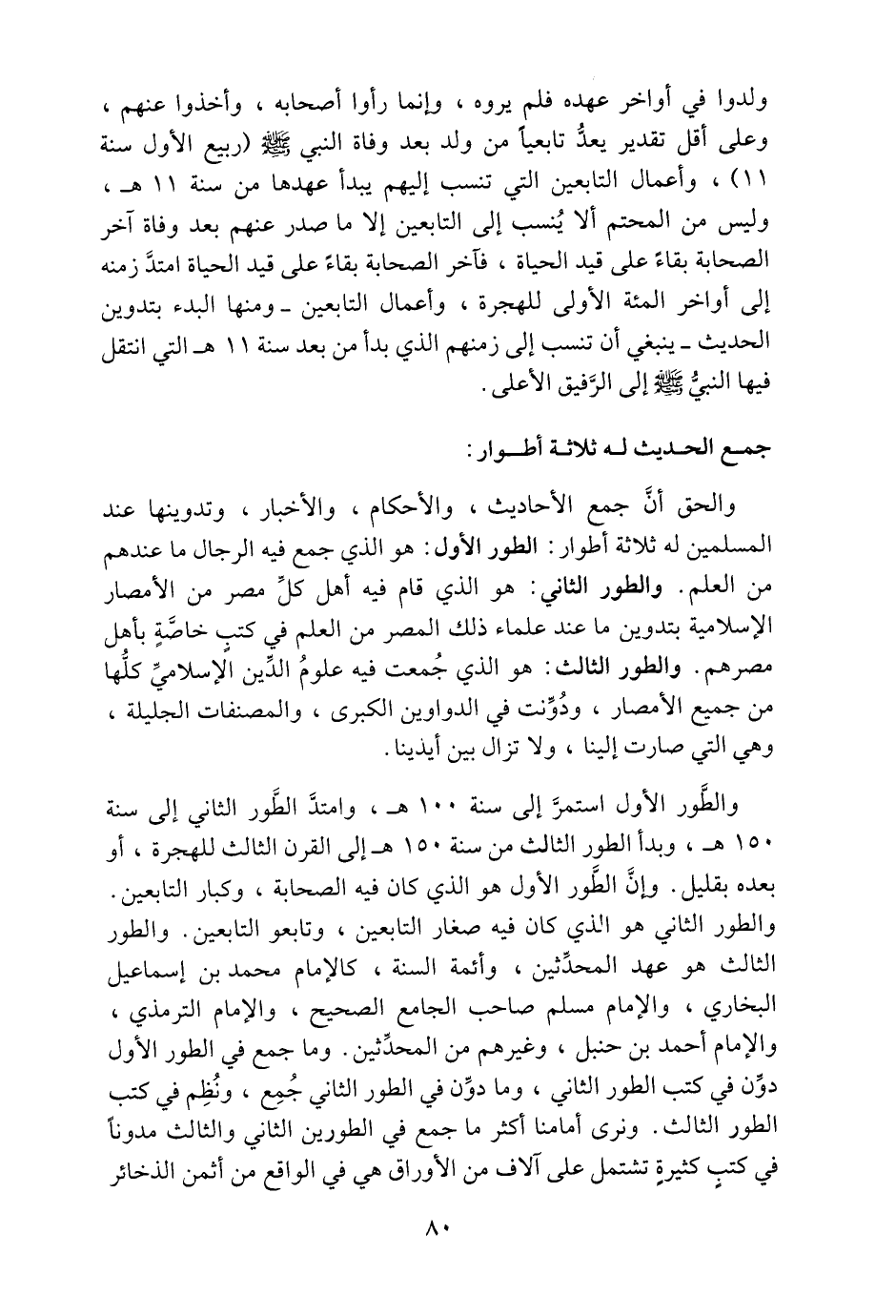 والطور الثاني هو الذي كان فيه صغار التابعين، وتابعو التابعين. والطور الثالث هو عهد المحدّثين، وأئمة السنة، كالإمام محمد بن إسماعيل البخاري، والإمام مسلم صاحب الجامع الصحيح، والإمام الترمذي، والإمام أحمد بن حنبل، وغيرهم من المحدّثين. وما جمع في الطور الأول دوّن في كتب الطور الثاني، وما دوّن في الطور الثاني جمع، ونظم في كتب الطور الثالث. ونرى أمامنا أكثر ما جمع في الطورين الثاني والثالث مدونا في كتب كثيرة تشتمل على آلاف من الأوراق هي في الواقع من أثمن الذخائر