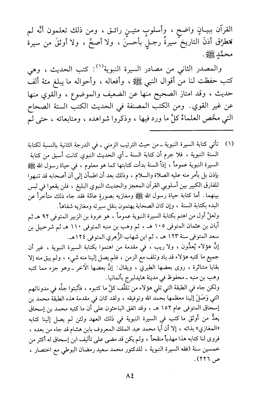 (1) تأتي كتابة السيرة النبوية- من حيث الترتيب الزمني- في الدرجة الثانية بالنسبة لكتابة السنة النبوية، فلا جرم أن كتابة السنة- أي الحديث النبوي كانت أسبق من كتابة السيرة النبوية عموما، إذا السنة بدأت كتابتها كما هو معلوم، في حياة رسول الله صلّى الله عليه وسلم بإذن بل بأمر منه عليه الصلاة والسلام، وذلك بعد أن اطمأن إلى أن أصحابه قد تنبهوا للفارق الكبير بين أسلوبي القرآن المعجز والحديث النبوي البليغ، فلن يقعوا في لبس بينهما. أما كتابة حياة رسول الله صلّى الله عليه وسلم ومغازيه بصورة عامّة فقد جاء ذلك متأخرا عن البدء بكتابة السنة، وإن كان الصحابة يهتمون بنقل سيرته ومغازيه شفاها. ولعلّ أول من اهتم بكتابة السيرة النبوية عموما، هو عروة بن الزبير المتوفى 92 هـ ثم أبان بن عثمان المتوفى 105 هـ، ثم وهب بن منبه المتوفى 110 هـ ثم شرحبيل بن سعد المتوفى سنة 123 هـ، ثم ابن شهاب الزّهري المتوفى 124 هـ. إنّ هؤلاء يعدّون، ولا ريب، في مقدمة من اهتموا بكتابة السيرة النبوية، غير أن جميع ما كتبه هؤلاء قد باد وتلف مع الزمن، فلم يصل إلينا منه شيء، ولم يبق منه إلا بقايا متناثرة، روى بعضها الطبري، ويقال: إنّ بعضها الآخر- وهو جزء مما كتبه وهب بن منبه- محفوظ في مدينة هايدلبرج بألمانيا. ولكن جاء في الطبقة التي تلي هؤلاء من تلقّف كلّ ما كتبوه، فأثبتوا جلّه في مدوناتهم التي وصل إلينا معظمها بحمد الله وتوفيقه، ولقد كان في مقدمة هذه الطبقة محمد بن إسحاق المتوفى عام 152 هـ، وقد اتفق الباحثون على أن ما كتبه محمد بن إسحاق يعدّ من أوثق ما كتب في السيرة النبوية في ذلك العهد ولئن لم يصل إلينا كتابه «المغازي» بذاته، إلا أن أبا محمد عبد الملك المعروف بابن هشام قد جاء من بعده، فروى لنا كتابه هذا مهذبا منقحا، ولم يكن قد مضى على تأليف ابن إسحاق له أكثر من خمسين سنة (فقه السيرة النبوية، للدكتور محمد سعيد رمضان البوطي مع اختصار، ص 226) .