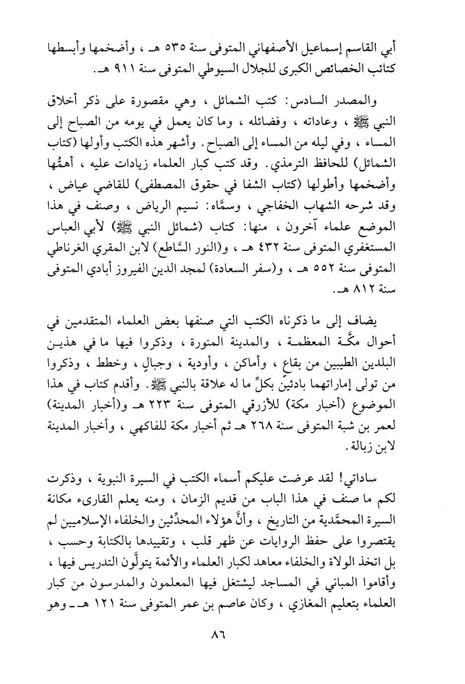 يضاف إلى ما ذكرناه الكتب التي صنفها بعض العلماء المتقدمين في أحوال مكّة المعظمة، والمدينة المنورة، وذكروا فيها ما في هذين البلدين الطيبين من بقاع، وأماكن، وأودية، وجبال، وخطط، وذكروا من تولى إماراتهما بادئين بكلّ ما له علاقة بالنبي صلّى الله عليه وسلم. وأقدم كتاب في هذا الموضوع (أخبار مكة) للأزرقي المتوفى سنة 223 هـ و (أخبار المدينة) لعمر بن شبة المتوفى سنة 268 هـ ثم أخبار مكة للفاكهي، وأخبار المدينة لابن زبالة.