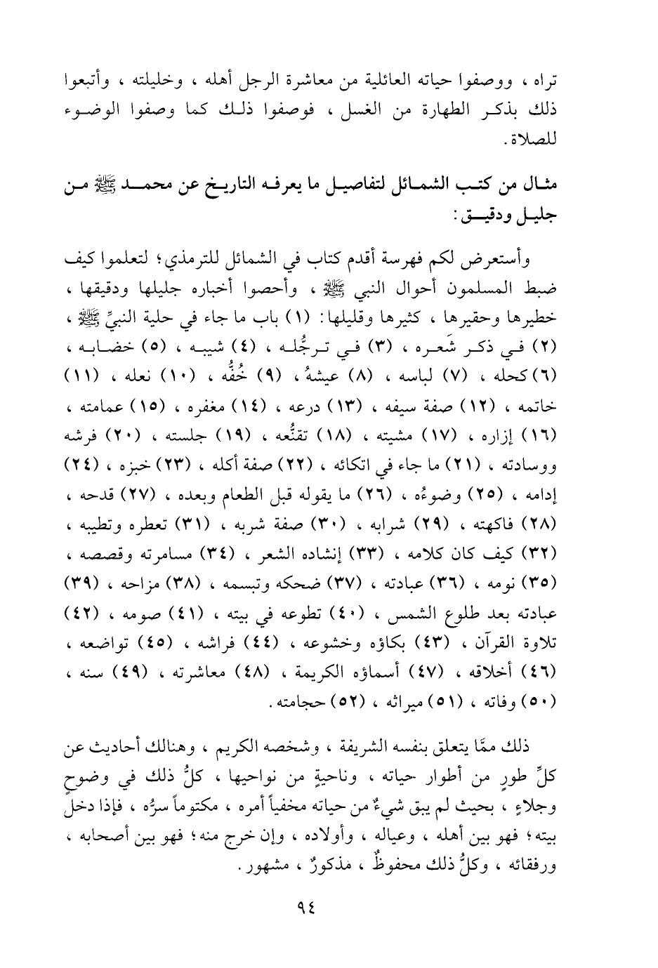 وأستعرض لكم فهرسة أقدم كتاب في الشمائل للترمذي؛ لتعلموا كيف ضبط المسلمون أحوال النبي صلّى الله عليه وسلم، وأحصوا أخباره جليلها ودقيقها، خطيرها وحقيرها، كثيرها وقليلها: (1) باب ما جاء في حلية النبيّ صلّى الله عليه وسلم، (2) في ذكر شعره، (3) في ترجّله، (4) شيبه، (5) خضابه، (6) كحله، (7) لباسه، (8) عيشه، (9) خفّه، (10) نعله، (11) خاتمه، (12) صفة سيفه، (13) درعه، (14) مغفره، (15) عمامته، (16) إزاره، (17) مشيته، (18) تقنّعه، (19) جلسته، (20) فرشه ووسادته، (21) ما جاء في اتكائه، (22) صفة أكله، (23) خبزه، (24) إدامه، (25) وضوءه، (26) ما يقوله قبل الطعام وبعده، (27) قدحه، (28) فاكهته، (29) شرابه، (30) صفة شربه، (31) تعطره وتطيبه، (32) كيف كان كلامه، (33) إنشاده الشعر، (34) مسامرته وقصصه، (35) نومه، (36) عبادته، (37) ضحكه وتبسمه، (38) مزاحه، (39) عبادته بعد طلوع الشمس، (40) تطوعه في بيته، (41) صومه، (42) تلاوة القرآن، (43) بكاؤه وخشوعه، (44) فراشه، (45) تواضعه، (46) أخلاقه، (47) أسماؤه الكريمة، (48) معاشرته، (49) سنه، (50) وفاته، (51) ميراثه، (52) حجامته.