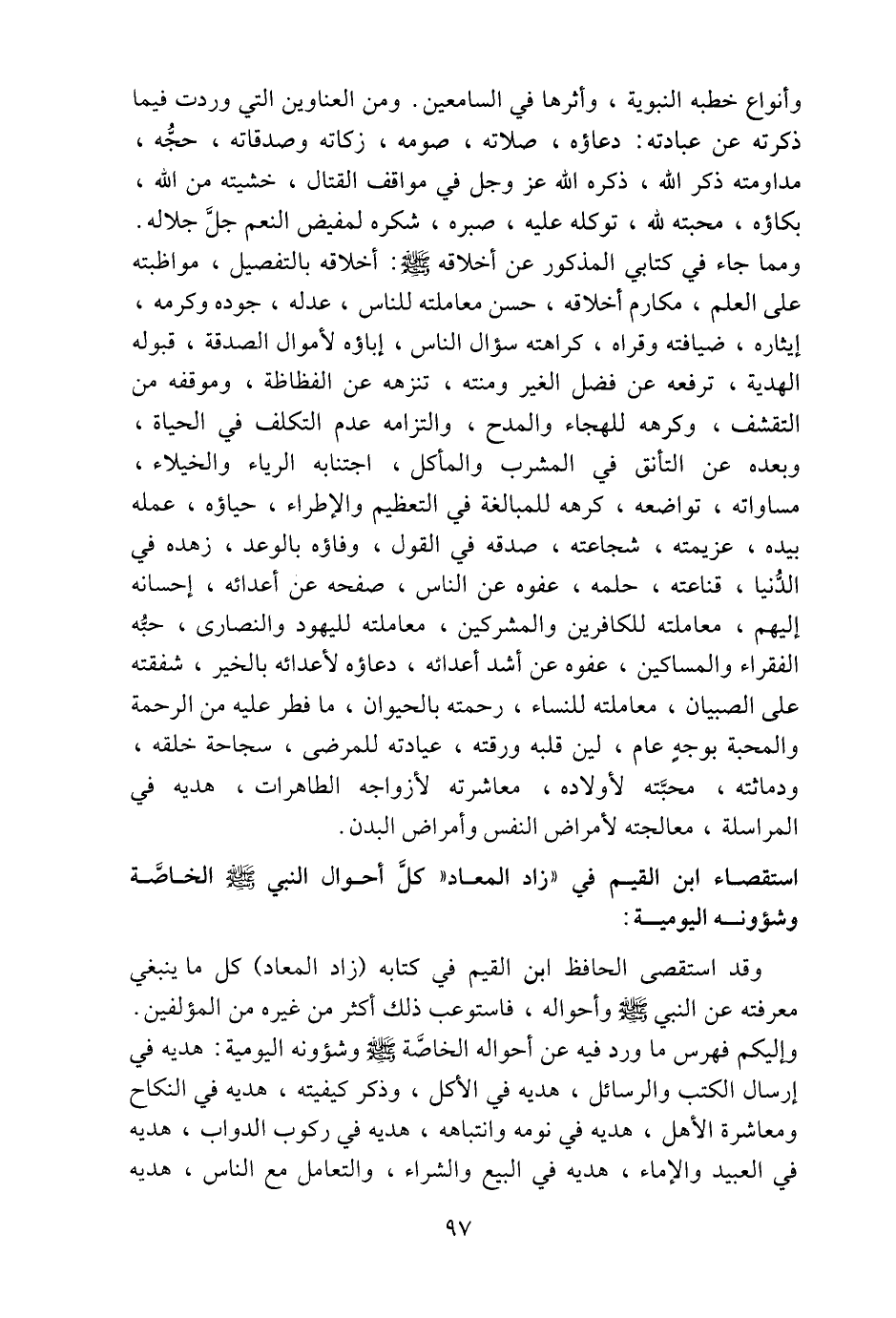 استقصاء ابن القيم في «زاد المعاد» كلّ أحوال النبي صلّى الله عليه وسلم الخاصّة وشؤونه اليومية: