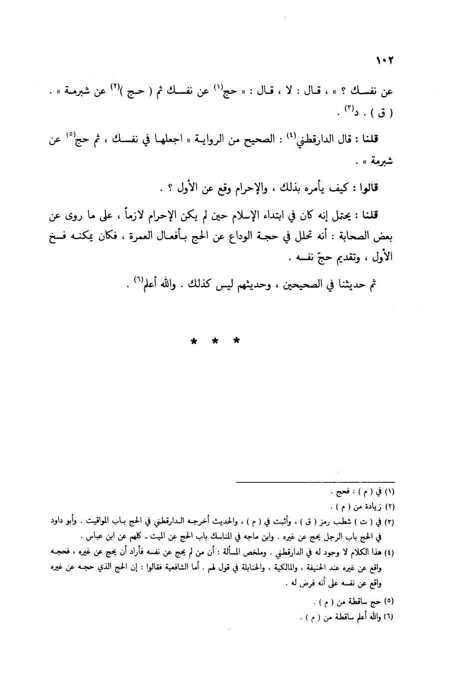 عَن نَفسك قَالَ لَا قَالَ حج عَن نَفسك ثمَّ حج عَن شبْرمَة (ق) د قُلْنَا قَالَ الدَّارَقُطْنِيّ الصَّحِيح من الرِّوَايَة اجْعَلْهَا فِي نَفسك ثمَّ حج عَن شبْرمَة قَالُوا كَيفَ يَأْمُرهُ بذلك وَالْإِحْرَام وَقع عَن الأول