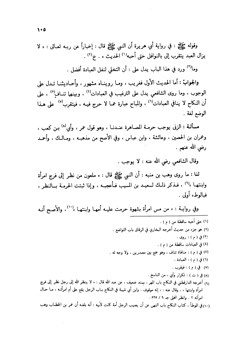 وَقَوله صلى الله عَلَيْهِ وَسلم فِي رِوَايَة أبي هُرَيْرَة أَن النَّبِي صلى الله عَلَيْهِ وَسلم قَالَ إِخْبَارًا عَن ربه تَعَالَى لَا يزَال العَبْد يتَقرَّب إِلَيّ بالنوافل حَتَّى أحبه الحَدِيث خَ وَمَا ورد فِي هَذَا الْبَاب يدل على أَن التخلي لنفل الْعِبَادَة أفضل وَالْجَوَاب أما الحَدِيث الأول فَغَرِيب وَمَا روينَاهُ مَشْهُور وأحاديثنا تدل على الْوُجُوب وَمَا روى الشَّافِعِي يدل على التَّرْغِيب فِي الْعِبَادَات وَبَينهمَا تناف على أَن النِّكَاح لَا يُنَافِي الْعِبَادَات والمباح عبارَة عَمَّا لَا حرج فِيهِ فيتقرب على هَذَا الْوَضع لُغَة
