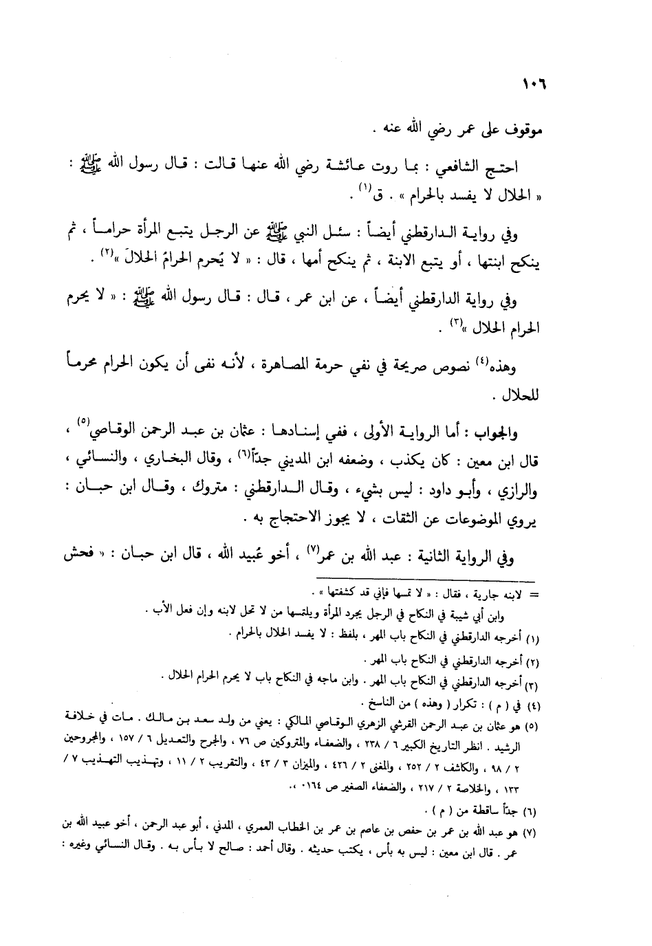 وَالْجَوَاب أما الرِّوَايَة الأولى فَفِي إسنادها عُثْمَان بن عبد الرحمن الوقاصي قَالَ ابْن معِين كَانَ يكذب وَضَعفه ابْن الْمَدِينِيّ جدا وَقَالَ البُخَارِيّ وَالنَّسَائِيّ والرازي وَأَبُو دَاوُد لَيْسَ بِشَيْء وَقَالَ الدَّارَقُطْنِيّ مَتْرُوك وَقَالَ ابْن حبَان يروي الموضوعات عَن الثِّقَات لَا يجوز الِاحْتِجَاج بِهِ