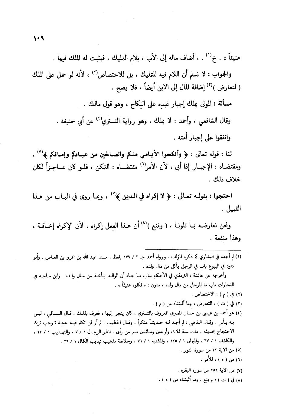 هَنِيئًا خَ أضَاف مَاله إِلَى الْأَب بلام التَّمْلِيك فَيثبت لَهُ الْملك فِيهَا وَالْجَوَاب لَا نسلم أَن اللَّام فِيهِ للتَّمْلِيك بل للاختصاص لِأَنَّهُ لَو حمل على الْملك لتعارض إِضَافَة المَال إِلَى الابْن أَيْضا فَلَا يَصح مَسْأَلَة الْمولى يملك إِجْبَار عَبده على النِّكَاح وَهُوَ قَول مَالك وَقَالَ الشَّافِعِي وَاحْمَدْ لَا يملك وَهُوَ رِوَايَة التسترِي عَن أبي حنيفَة وَاتَّفَقُوا على إِجْبَار أمته لنا قَوْله تَعَالَى {وَأنْكحُوا الْأَيَامَى مِنْكُم وَالصَّالِحِينَ من عبادكُمْ وَإِمَائِكُمْ} وَمُقْتَضَاهُ الْإِجْبَار إِذا أَبى لِأَن الْأَمر مُقْتَضَاهُ التَّمَكُّن فَلَو كَانَ عَاجِزا لَكَانَ خلاف ذَلِك احْتَجُّوا بقوله تَعَالَى {لَا إِكْرَاه فِي الدّين} وَبِمَا روى فِي الْبَاب من هَذَا الْقَبِيل وَنحن نعارضه بِمَا تلونا (ونمنع) أَن هَذَا الْفِعْل إِكْرَاه لِأَن الْإِكْرَاه إخافة وَهَذَا مَنْفَعَة