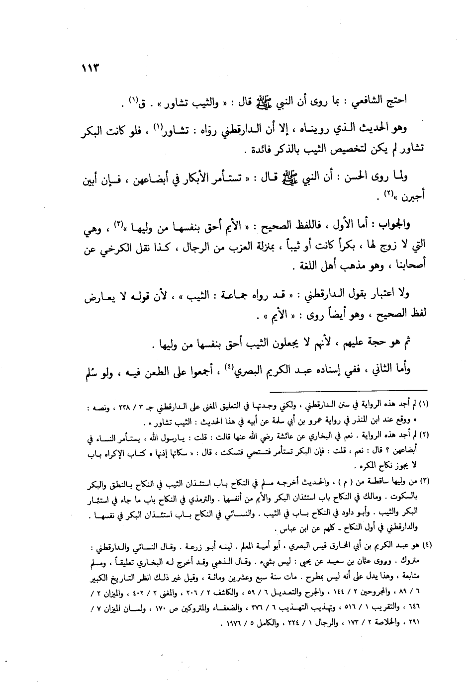 وَلَا اعْتِبَار بقول الدَّارَقُطْنِيّ قد رَوَاهُ جمَاعَة الثّيّب لِأَن قَوْله لَا يُعَارض لفظ الصَّحِيح وَهُوَ أَيْضا روى الأيم ثمَّ هُوَ حجَّة عَلَيْهِم لأَنهم لَا يجْعَلُونَ الثّيّب أَحَق بِنَفسِهَا من وَليهَا وَأما الثَّانِي فَفِي إِسْنَاده عبد الكريم الْبَصْرِيّ أَجمعُوا على الطعْن فِيهِ وَلَو سلم