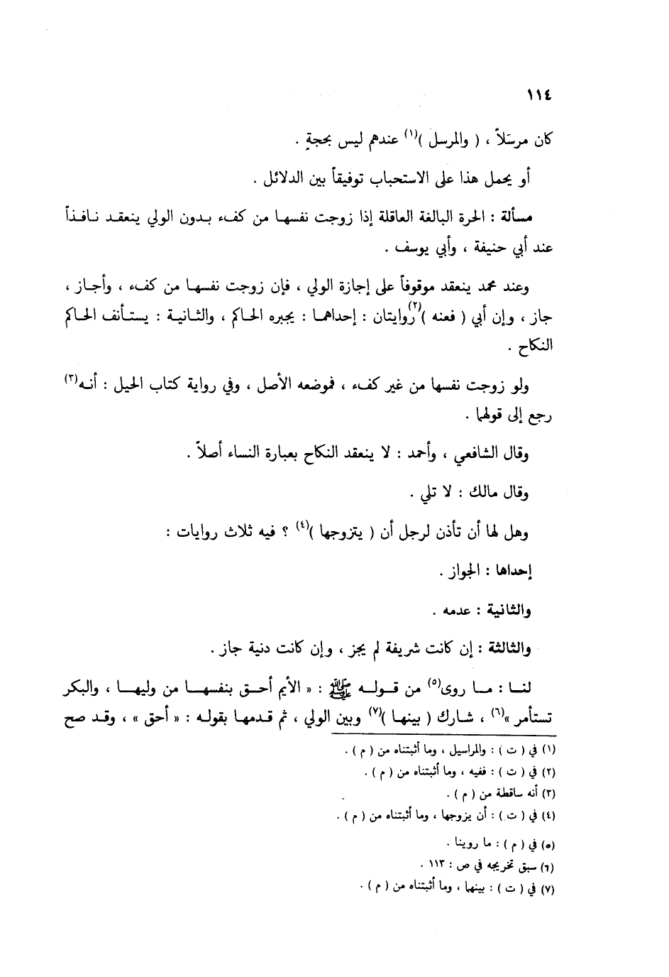 مَسْأَلَة الْحرَّة الْبَالِغَة الْعَاقِلَة إِذا زوجت نَفسهَا من كُفْء بِدُونِ الْوَلِيّ ينْعَقد نَافِذا عِنْد أبي حنيفَة وَأبي يُوسُف