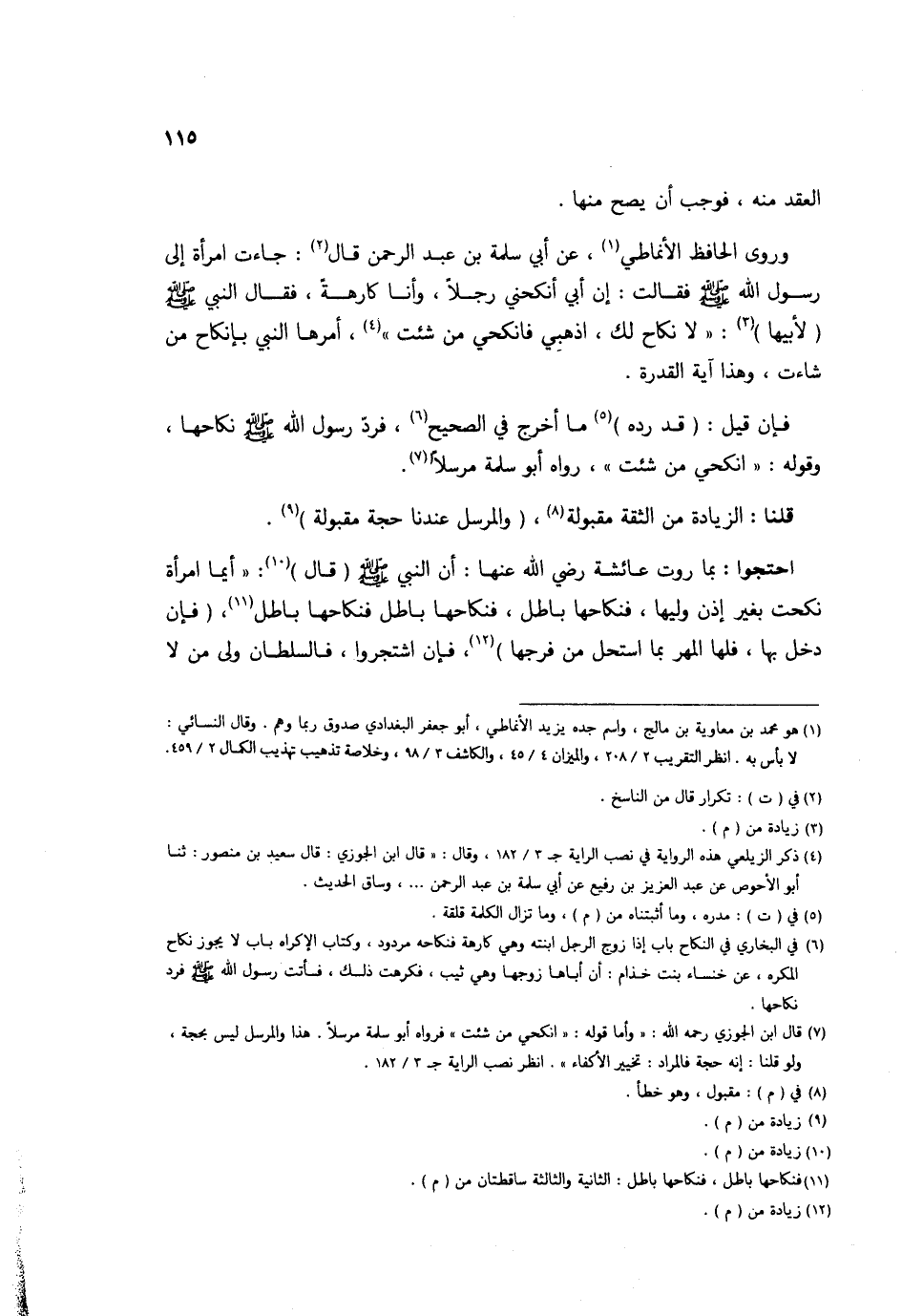 وروى الْحَافِظ الْأنمَاطِي عَن أبي سَلمَة بن عبد الرحمن قَالَ جَاءَت امْرَأَة إِلَى رَسُول الله صلى الله عَلَيْهِ وَسلم فَقَالَت إِن أبي أنكحني رجلا وَأَنا كارهة فَقَالَ النَّبِي صلى الله عَلَيْهِ وَسلم لأَبِيهَا لَا نِكَاح لَك اذهبي فَانْكِحِي من شِئْت أمرهَا النَّبِي بإنكاح من شَاءَت وَهَذَا آيَة الْقُدْرَة