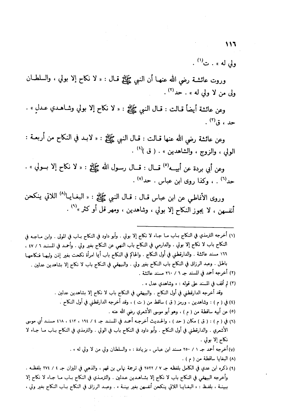 وروت عَائِشَة رَضِي الله عَنْهَا أَن رَسُول الله صلى الله عَلَيْهِ وَسلم قَالَ لَا نِكَاح إِلَّا بولِي وَالسُّلْطَان ولي من لَا ولي لَهُ حد وَعَن عَائِشَة أَيْضا قَالَت قَالَ النَّبِي صلى الله عَلَيْهِ وَسلم لَا نِكَاح إِلَّا بولِي وشاهدي عدل حد ق