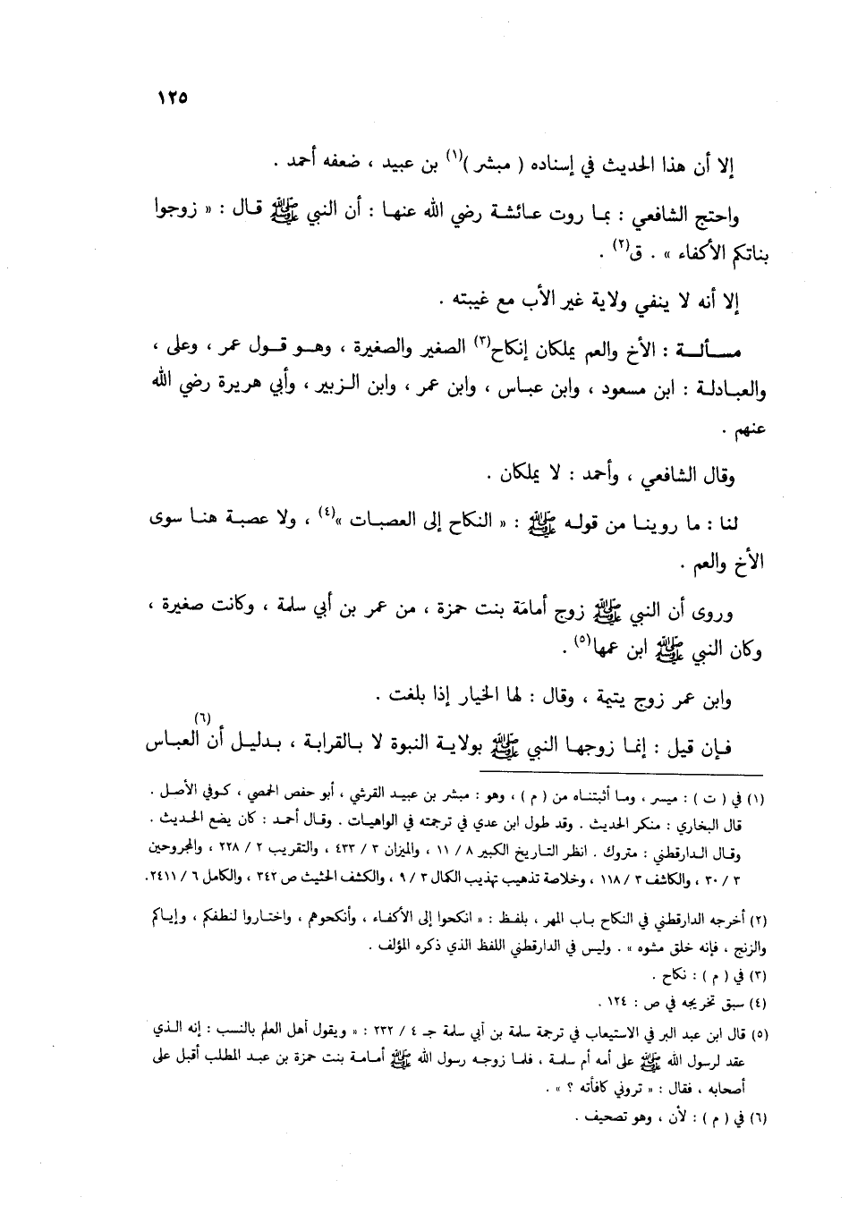 مَسْأَلَة الْأَخ وَالْعم يملكَانِ إنكاح الصَّغِير وَالصَّغِيرَة وَهُوَ قَول عمروعلي والعبادلة ابْن مَسْعُود وَابْن عَبَّاس وَابْن عمر وَابْن الزبير وَأبي هُرَيْرَة رَضِي الله عَنْهُم وَقَالَ الشَّافِعِي وَاحْمَدْ لَا يملكَانِ لنا مَا روينَا من قَوْله صلى الله عَلَيْهِ وَسلم النِّكَاح إِلَى الْعَصَبَات وَلَا عصبَة هُنَا سوى الْأَخ وَالْعم وروى أَن النَّبِي صلى الله عَلَيْهِ وَسلم زوج أُمَامَة بنت حَمْزَة من عمر بن أبي سَلمَة وَكَانَت صَغِيرَة وَكَانَ النَّبِي صلى الله عَلَيْهِ وَسلم ابْن عَمها وَابْن عمر زوج يتيمة وَقَالَ لَهَا الْخِيَار إِذا بلغت فَإِن قيل إِنَّمَا زَوجهَا النَّبِي صلى الله عَلَيْهِ وَسلم بِولَايَة النُّبُوَّة لَا بِالْقَرَابَةِ بِدَلِيل أَن الْعَبَّاس