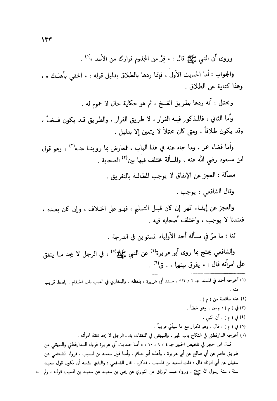 وَرُوِيَ أَن النَّبِي صلى الله عَلَيْهِ وَسلم قَالَ فر من المجذوم فرارك من الْأسد وَالْجَوَاب أما الحَدِيث الأول فَإِنَّمَا ردهَا بِالطَّلَاق بِدَلِيل قَوْله الحقي بأهلك وَهَذَا كِنَايَة عَن الطَّلَاق وَيحْتَمل أَنه ردهَا بطرِيق الفسح ثمَّ هُوَ حِكَايَة حَال لَا عُمُوم لَهُ وَأما الثَّانِي فالمذكور فِيهِ الْفِرَار لَا طَرِيق الْفِرَار وَالطَّرِيق قد يكون فسخا وَقد يكون طَلَاقا وَمَتى كَانَ مُحْتملا لَا يتَعَيَّن إِلَّا بِدَلِيل وَأما قَضَاء عمر وَمَا جَاءَ عَنهُ فِي هَذَا الْبَاب فمعارض بِمَا روينَا عَنهُ وَهُوَ قَول ابْن مَسْعُود رَضِي الله عَنهُ وَالْمَسْأَلَة مُخْتَلف فِيهَا بَين الصَّحَابَة مَسْأَلَة الْعَجز عَن الْإِنْفَاق لَا يُوجب الْمُطَالبَة بِالتَّفْرِيقِ وَقَالَ الشَّافِعِي يُوجب وَالْعجز عَن إِيفَاء الْمهْر إِن كَانَ قبل التَّسْلِيم فَهُوَ على الْخلاف وَإِن كَانَ بعده فعندنا لَا يُوجب وَاخْتلف أَصْحَابه فِيهِ لنا مَا مر فِي مَسْأَلَة أحد الْأَوْلِيَاء المستوين فِي الدرجَة وَالشَّافِعِيّ يحْتَج بِمَا روى أَبُو هُرَيْرَة عَن النَّبِي صلى الله عَلَيْهِ وَسلم فِي الرجل لَا يجد مَا ينْفق على امْرَأَته قَالَ يفرق بَينهمَا ق