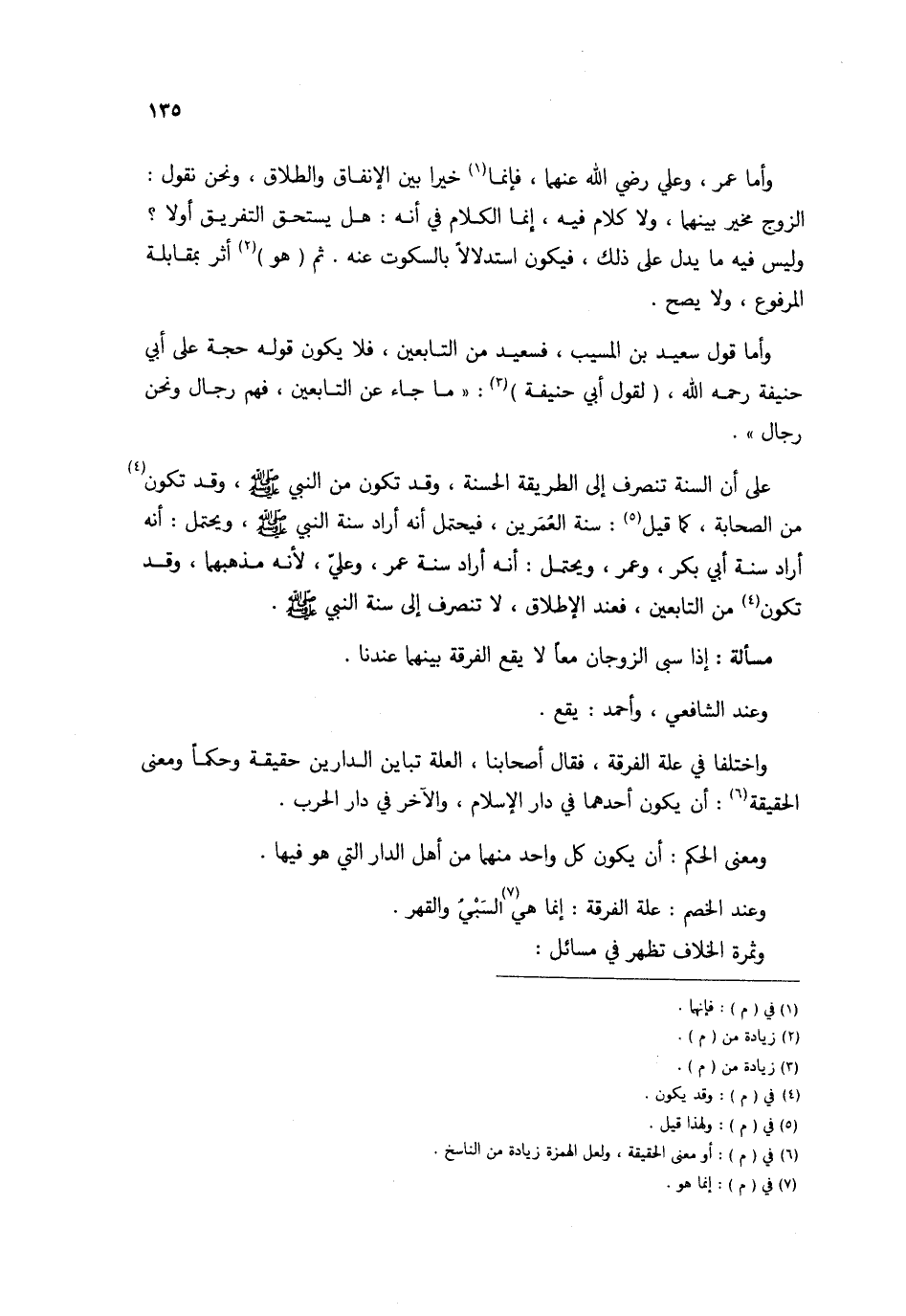 على أَن السّنة تَنْصَرِف إِلَى الطَّرِيقَة الْحَسَنَة وَقد تكون من النَّبِي صلى الله عَلَيْهِ وَسلم وَقد تكون من الصَّحَابَة كَمَا قيل سنة العمرين فَيحْتَمل أَنه أَرَادَ سنة النَّبِي صلى الله عَلَيْهِ وَسلم وَيحْتَمل أَنه أَرَادَ سنة أبي بكر وَعمر وَيحْتَمل أَنه أَرَادَ سنة عمر وَعلي لِأَنَّهُ مَذْهَبهمَا وَقد تكون من التَّابِعين فَعِنْدَ الْإِطْلَاق لَا تَنْصَرِف إِلَى سنة النَّبِي صلى الله عَلَيْهِ وَسلم مَسْأَلَة إِذا سبى الزَّوْجَانِ مَعًا لَا يَقع الْفرْقَة بَينهمَا عندنَا وَعند الشَّافِعِي وَاحْمَدْ يَقع