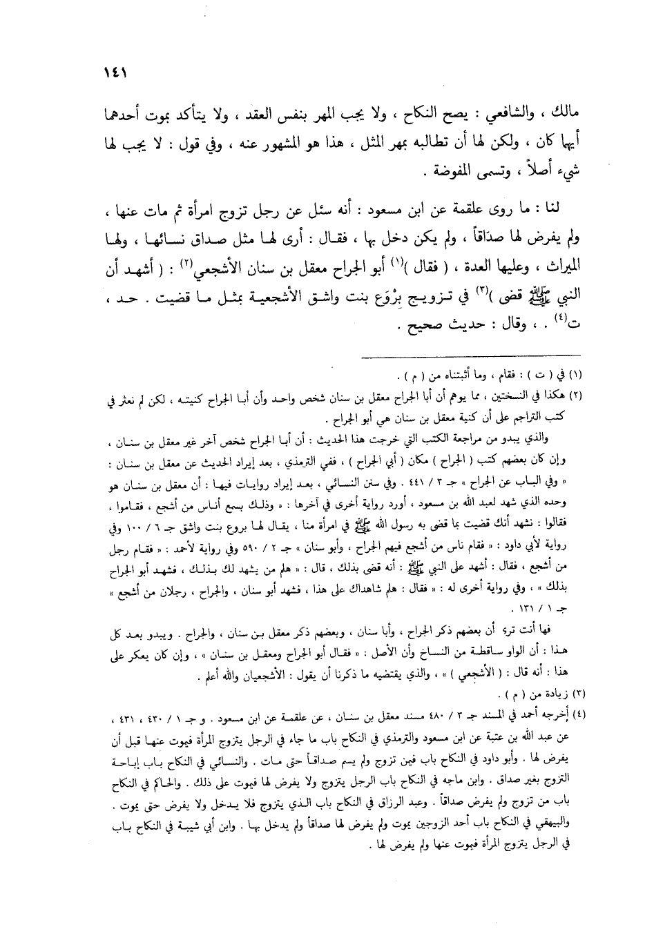 لنا مَا روى عَلْقَمَة عَن ابْن مَسْعُود أَنه سُئِلَ عَن رجل تزوج امْرَأَة ثمَّ مَاتَ عَنْهَا وَلم يفْرض لَهَا صَدَاقا وَلم يكن دخل بهَا فَقَالَ أرى لَهَا مثل صدَاق نسائها وَلها الْمِيرَاث وَعَلَيْهَا الْعدة فَقَالَ أَبُو الْجراح معقل بن سِنَان الْأَشْجَعِيّ (أشهد أَن النَّبِي صلى الله عَلَيْهِ وَسلم قضى) فِي تَزْوِيج بروع بنت واشق الأشجعية بِمثل مَا قضيت حد ت وَقَالَ حَدِيث صَحِيح