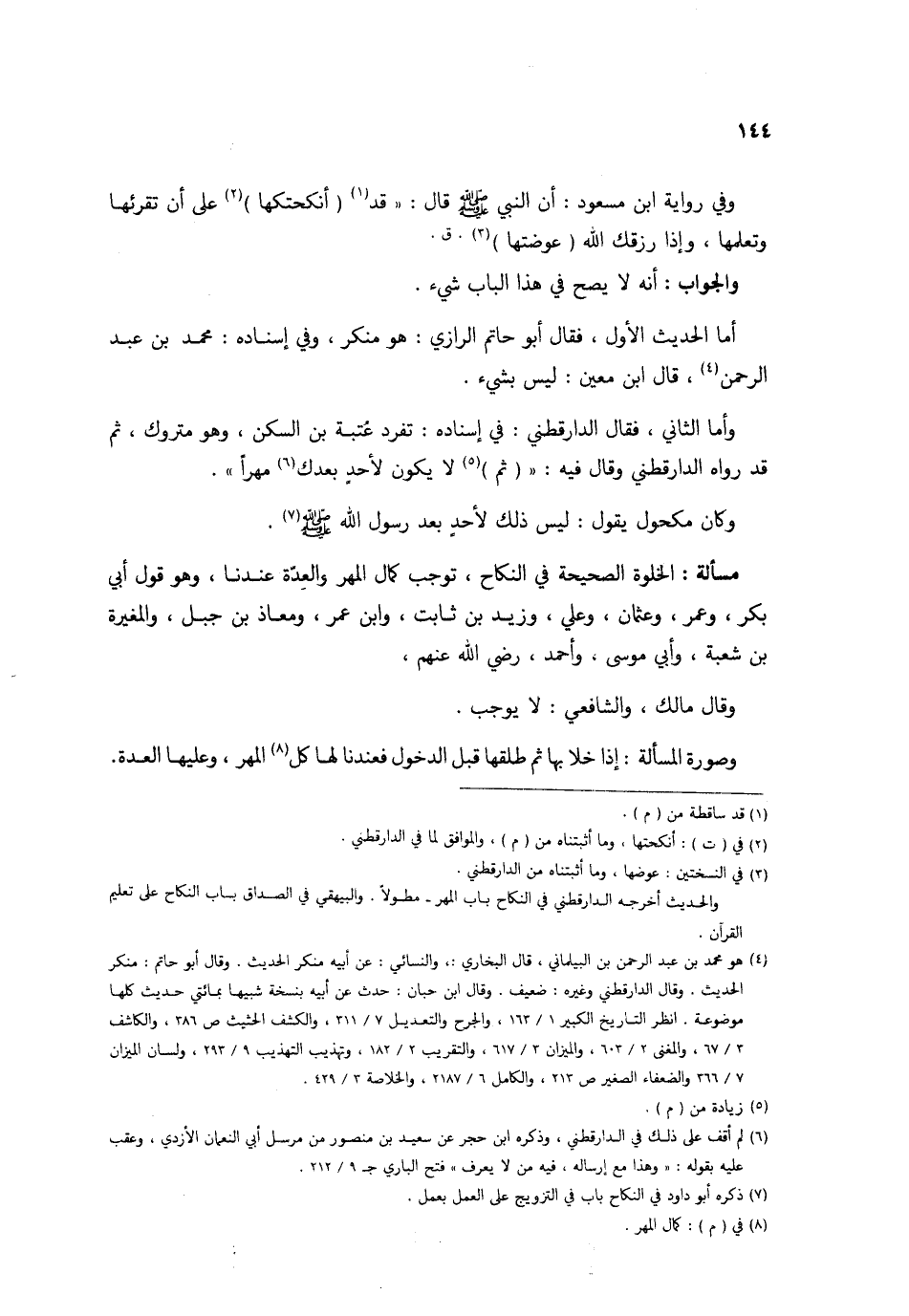 وَأما الثَّانِي فَقَالَ الدَّارَقُطْنِيّ فِي إِسْنَاده تفرد عتبَة بن السكن وَهُوَ مَتْرُوك ثمَّ قد رَوَاهُ الدَّارَقُطْنِيّ وَقَالَ فِيهِ (ثمَّ) لَا يكون لأحد بعْدك مهْرا وَكَانَ مَكْحُول يَقُول لَيْسَ ذَلِك لأحد بِعْ رَسُول الله صلى الله عَلَيْهِ وَسلم