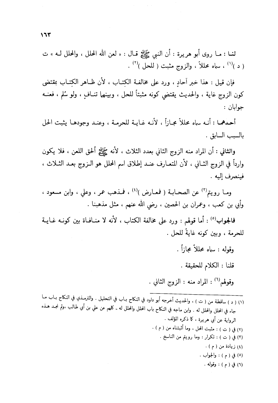 وَالثَّانِي أَن المُرَاد مِنْهُ الزَّوْج الثَّانِي بعد الثَّلَاث لِأَنَّهُ صلى الله عَلَيْهِ وَسلم ألحق اللَّعْن فَلَا يكون واردا فِي الزَّوْج الثَّانِي لِأَن الْمُتَعَارف عِنْد إِطْلَاق إسم الْمُحَلّل هُوَ الزَّوْج بعد الثَّلَاث فَيَنْصَرِف اليه