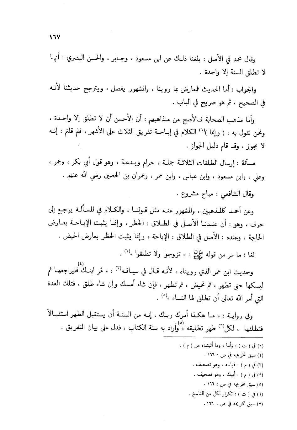 وَعَن أَحْمد كالمذهبين وَالْمَشْهُور عَنهُ مثل قَوْلنَا وَالْكَلَام فِي الْمَسْأَلَة يرجع الى حرف وَهُوَ أَن عندنَا الأَصْل فِي الطَّلَاق الْحَظْر وَإِنَّمَا يثبت الْإِبَاحَة بِعَارِض الْحَاجة وَعِنْده الأَصْل فِي الطَّلَاق الْإِبَاحَة وَإِنَّمَا يثبت الْحَظْر بِعَارِض الْحيض