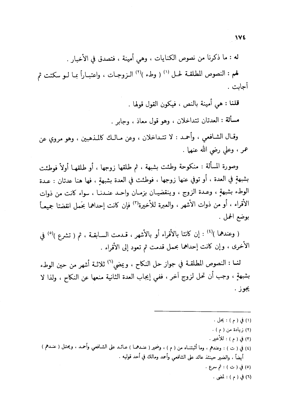 لَهُ مَا ذكرنَا من نُصُوص الْكِنَايَات وَهِي أمينة فَتصدق فِي الْأَخْبَار لَهُم النُّصُوص الْمُطلقَة لحل (وَطْء) الزَّوْجَات واعتبارا بِمَا لَو سكتت ثمَّ أجابت قُلْنَا هِيَ أمينة بِالنَّصِّ فَيكون القَوْل قَوْلهَا مَسْأَلَة العدتان تتداخلان وَهُوَ قَول معَاذ وَجَابِر وَقَالَ الشَّافِعِي وَاحْمَدْ لَا تتداخلان وَعَن مَالك كالمذهبين وَهُوَ مَرْوِيّ عَن عمر وَعلي رَضِي الله عَنْهُمَا