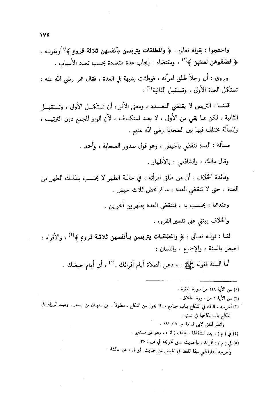 قُلْنَا التَّرَبُّص لَا يَقْتَضِي التَّعَدُّد وَمعنى الْأَثر أَن تستكمل الأولى وتستقبل الثَّانِيَة لَكِن بِمَا بَقِي من الأولى لَا بعد استكمالها لِأَن الْوَاو للْجمع دون التَّرْتِيب وَالْمَسْأَلَة مُخْتَلف فِيهَا بَين الصَّحَابَة رَضِي الله عَنْهُم مَسْأَلَة الْعدة تَنْقَضِي بِالْحيضِ وَهُوَ قَول صُدُور الصَّحَابَة وَأحمد وَقَالَ مَالك وَالشَّافِعِيّ بالأطهار وَفَائِدَة الْخلاف أَن من طلق امْرَأَته فِي حَالَة الطُّهْر لَا يحْتَسب بذلك الطُّهْر من الْعدة حَتَّى لَا تَنْقَضِي الْعدة مالم تَحض ثَلَاث حيض وَعِنْدَهُمَا يحْتَسب بِهِ فتنقضي الْعدة بطهرين آخَرين وَالْخلاف يبتني على تَفْسِير القروء لنا قَوْله تَعَالَى {والمطلقات يَتَرَبَّصْنَ بِأَنْفُسِهِنَّ ثَلَاثَة قُرُوء} والأقراء الْحيض بِالسنةِ وَالْإِجْمَاع وَاللِّسَان أما السّنة فَقَوله صلى الله عَلَيْهِ وَسلم دعِي الصَّلَاة أَيَّام إقرائك أَي أَيَّام حيضك